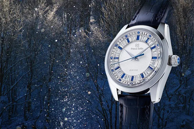 Taking inspiration from the tiny ice crystals that shimmer on a cold, clear morning in the Shinshu region, the dial center has a βdiamond dustβ texture that creates a subtle sparkle and a unique beauty. Carefully selected and tapered baguette diamonds and blue sapphires surround the dial as minute and hour markers, set over an 18k white gold base. The arrangement of the diamonds and sapphires side by side around the entire dial requires great dexterity; the gems are set between a very thin pair of rails with great precision by the most skilled of the jewelry craftsmen and women at the Shinshu Watch Studio. The diamonds and sapphires are placed exactly horizontally so that they catch the light evenly and the sapphire at twelve oβclock is slightly wider than others to ensure perfect legibility. Enhancing the beauty of the dial are 48 additional diamonds and 12 blue sapphires individually set around the markers. The case is made of Platinum 950 and is finished with a form of Zaratsu polishing that is specially adapted for working with platinum to create the brilliant look that defines Grand Seiko.