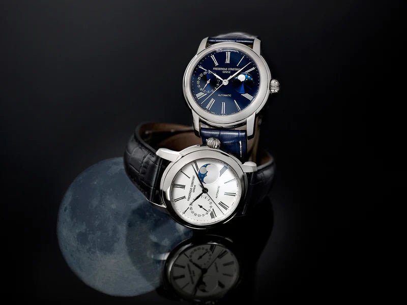 The New FC-712 Movement The newest in-house calibre is the FC-712 automatic movement, thus becoming the 29th addition to an ever-growing collection. Based on the iconic FC-700 movement series from Frederique Constant, it has been redesigned in order to split the moonphase and date into two counters. Both functions are adjustable via the crown. Through the transparent caseback, the movement shows off the famous Perlage andcircular CΓ΄tes de GenΓ¨ve decorations present on all Frederique Constant in-house calibers. It took the brandβs R&D department and watchmakers two years to perfect this movement and introduce it to the watchmaking market. The Watch The timepiece offers three variations: silver or navy blue-coloured dials and in either rose gold-plated or polished stainless-steel case. The 42mm 3 parts-case holds a convex sapphire crystal and see-through caseback revealing the inner workings of the FC-712 caliber, offering a 38-hour power reserve. The two counters of the moonphase and date are respectively located at three and nine oβclock. The elegant curved dial merges seamlessly with the case showcasing printed roman numeral indexes and hand-polished hands. Finally, the dark brown, black or blue croco calfleather strap completes the look.