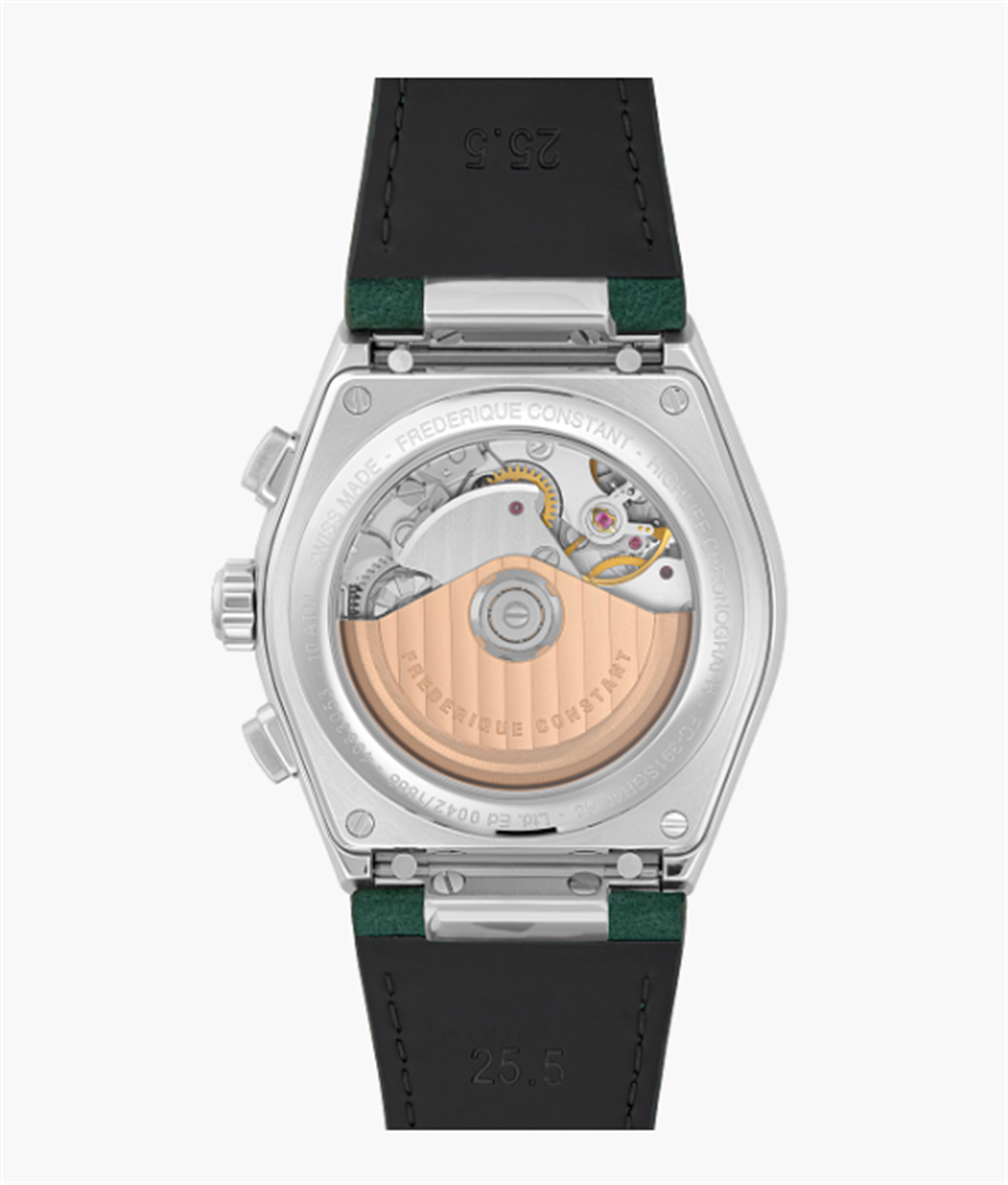 Featuring the iconic Highlife design, the Highlife Chronograph Automatic is equipped with the FC-391 movement, offering a 60-hour power reserve, and features a brushed and polished satin finish on its case, sides, and bezel. Two pushers appear, at 2 and 4 oβclock, they control the start/stop of the chronograph, as well as its reset. The chronograph counters have an inward curved collar, offering a more precise reading of the chronograph indications. On the back, the case features an anti-reflective sapphire crystal that allows you to admire the automatic movement and its chronograph module β including its column wheel located at 3 oβclock. Comes on a green nubuck leather strap and also includes an additional stainless steel bracelet and green rubber strap which can all be changed easily thanks to a quick release system. Limited edition of 1888 pcs.