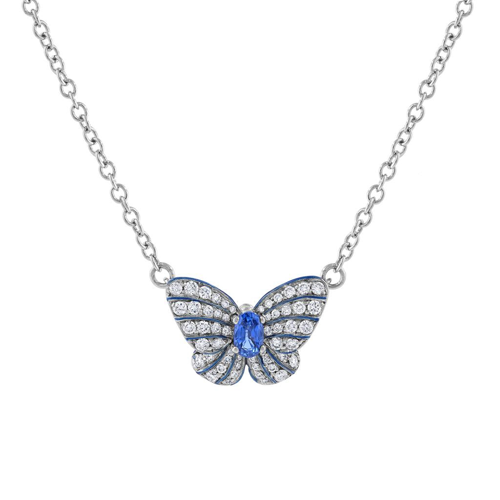 LaViano Fashion 18K White Gold Sapphire Diamond and Enamel Butterfly Necklace