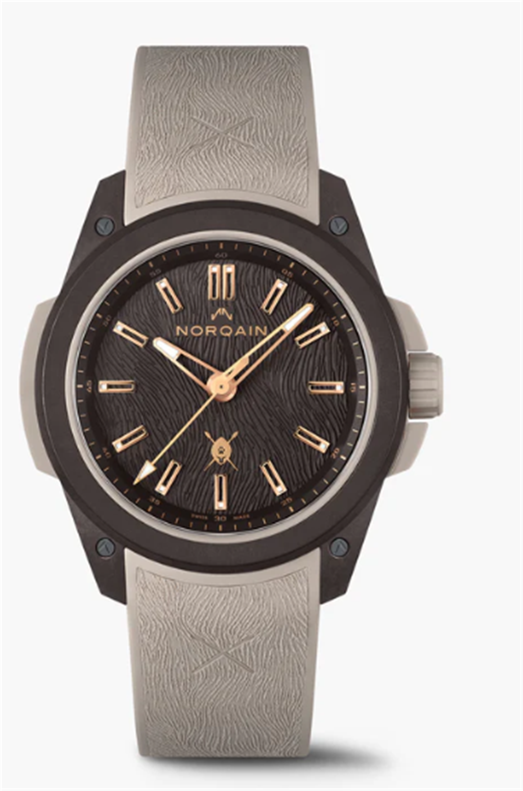 Screw-down crown, overmolded with sand colour rubber and NORQAIN logo