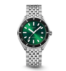 Unveiled at Baselworld 2019, this 3-hand diver's watch has a case made of highest-quality 316L stainless steel. At a diameter of 42 mm, the SUB 200 is topped by a scratch-resistant sapphire crystal with an anti-reflective coating and the distinctive curvature of the domed plexiglass used back in the day. Waterproof to a depth of 200 meters (20 ATM), the model features a unidirectional rotating bezel. All the elements providing dive-relevant information, including the bezel, have a Super‑LumiNova® luminescent coating. The bracelet is 316L stainless steel and features a folding clasp with the DOXA fish symbol.