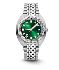 In 1968, DOXA launched the SUB 300T Conquistador, the first general public diver's watch equipped with a helium release valve. 50 years later, the new SUB 300T presented in September 2019 pays tribute to the groundbreaking original. This 3-hand diver's watch, available in 8 dial colors, combines the aesthetic genes of the SUB 300T Conquistador with the technical refinements that define the high-performance diver's watch of today. Constructed from 316L stainless steel of the highest quality, the SUB 300T has a diameter of 42.5mm and a scratch-resistant sapphire crystal with an anti-reflective coating. Rated to withstand pressures up to 120 bar, this diver is effectively waterproof to a depth of 1,200 meters and features the patented unidirectional rotating bezel with an integrated no-decompression dive time calculator. All elements providing dive-relevant information are highlighted with a Super‑LumiNova® luminescent insert to ensure optimal legibility underwater. The bracelet is 316L stainless steel and features a folding clasp with the DOXA fish symbol.