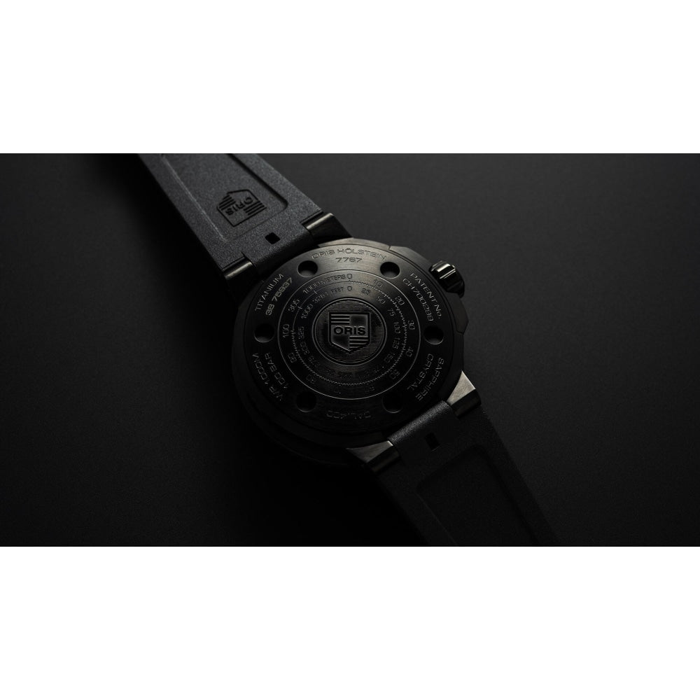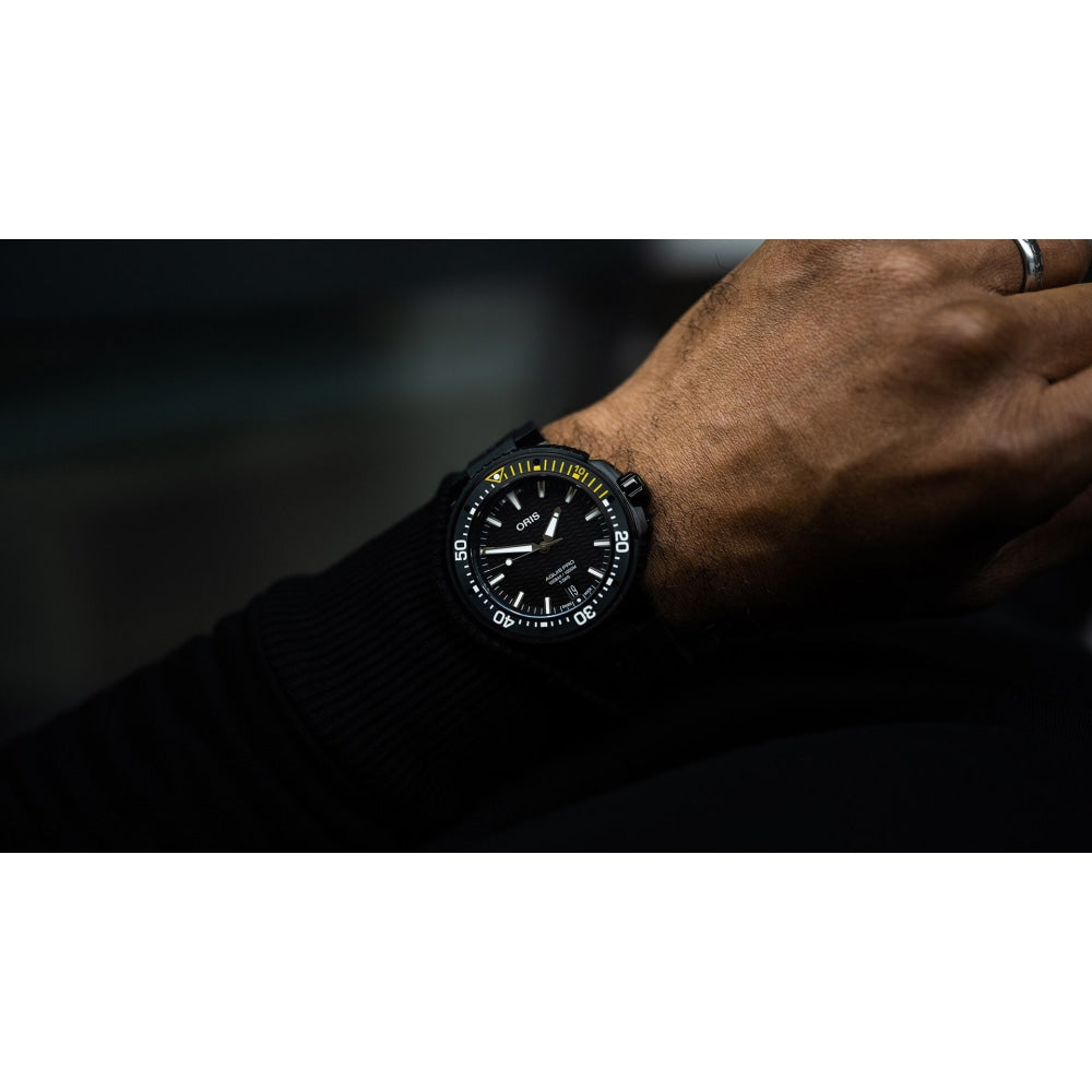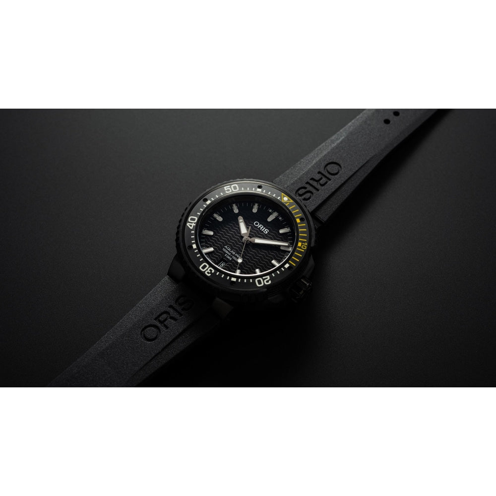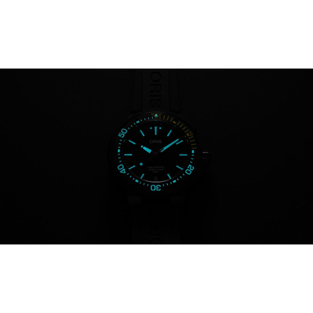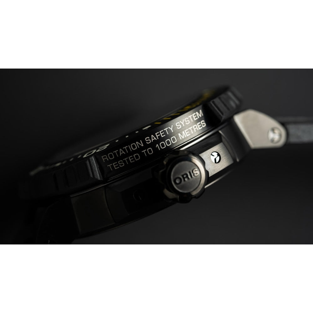 The AquisPro Date is a natural home for Orisβs high-performance Calibre 400. Designed to serve professional divers on saturation dives, itβs a highly technical tool watch chosen by divers who work on complex engineering projects in helium-enriched environments hundreds of metres below the waterβs surface. Among its special features is Orisβs patented Rotation Safety System, known as RSS. This exclusive Oris device, commissioned by the professional diving community, enables the wearer to adjust and lock the uni-directional rotating bezel into place. This means that during a dive they can read off remaining dive time with absolute certainty. A chunky rubber grip makes it easy to operate, even when gloved, while a yellow and white minutes scale engraved into the scratch-resistant ceramic bezel insert delivers high levels of low-light legibility.