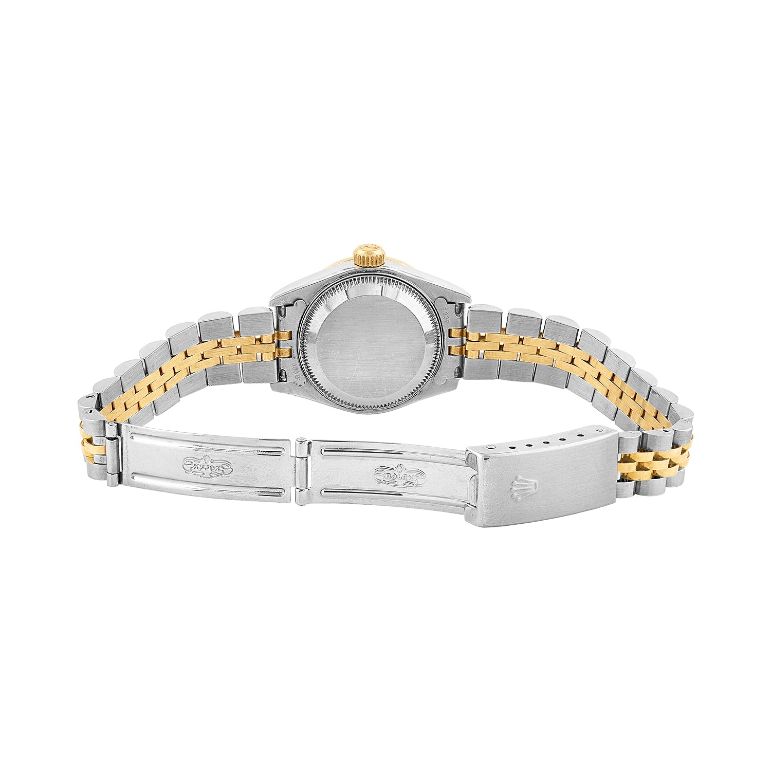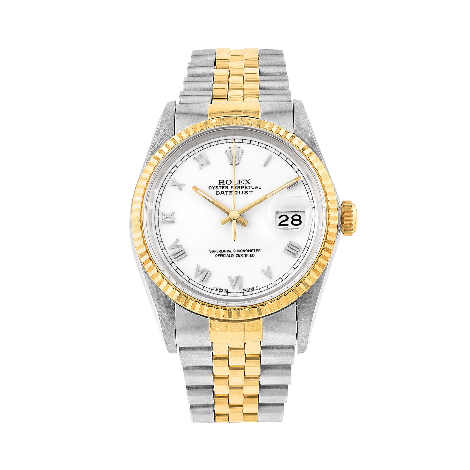Rolex Datejust Men's 2-Tone Watch 16013 - Automatic winding, 27 jewels, Quickset, acrylic crystal. Stainless steel case with 18k yellow gold fluted bezel (36mm diameter). White dial with Roman numerals. Stainless steel and 18k yellow gold Jubilee bracelet. Pre-owned comes with a generic box