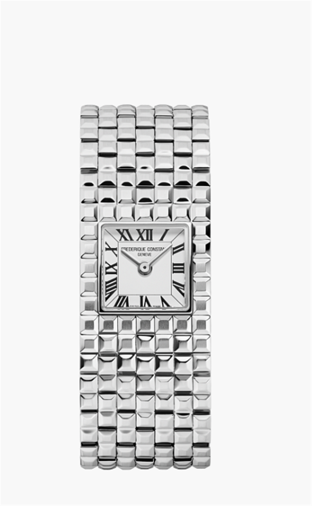 Inspired by the iconic model launched in 2002, Frederique Constant reinterprets the Classics Manchette in 2025, presenting a timepiece with an elegant and contemporary design. Its bold character is reflected in every detail, particularly in its seven-link stainless steel bracelet, featuring a Clou de Paris shape. This version features a bold white matte finish square- shaped dial with printed Roman numerals, and silver tone hours and minutes. Powered by the FC-200 quartz movement, the Classics Manchette appeals to the woman seeking a watch with a unique presence, capable of enhancing any wrist with character, style, and distinction.