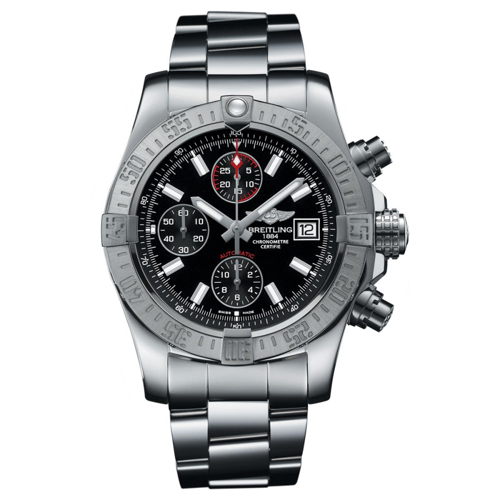 This Breitling Avenger II Chronograph (ref. A1338111/BC32) features the Breitling Caliber 13 mechanical automatic movement; "Volcano Black" dial with index hour markers; chronograph with 30-minute counter at 12 o'clock & 12-hour counter at 6 o'clock; small seconds subdial at 9 o'clock; date aperture at 3 o’clock; and 43mm, stainless steel case on a stainless steel link bracelet.