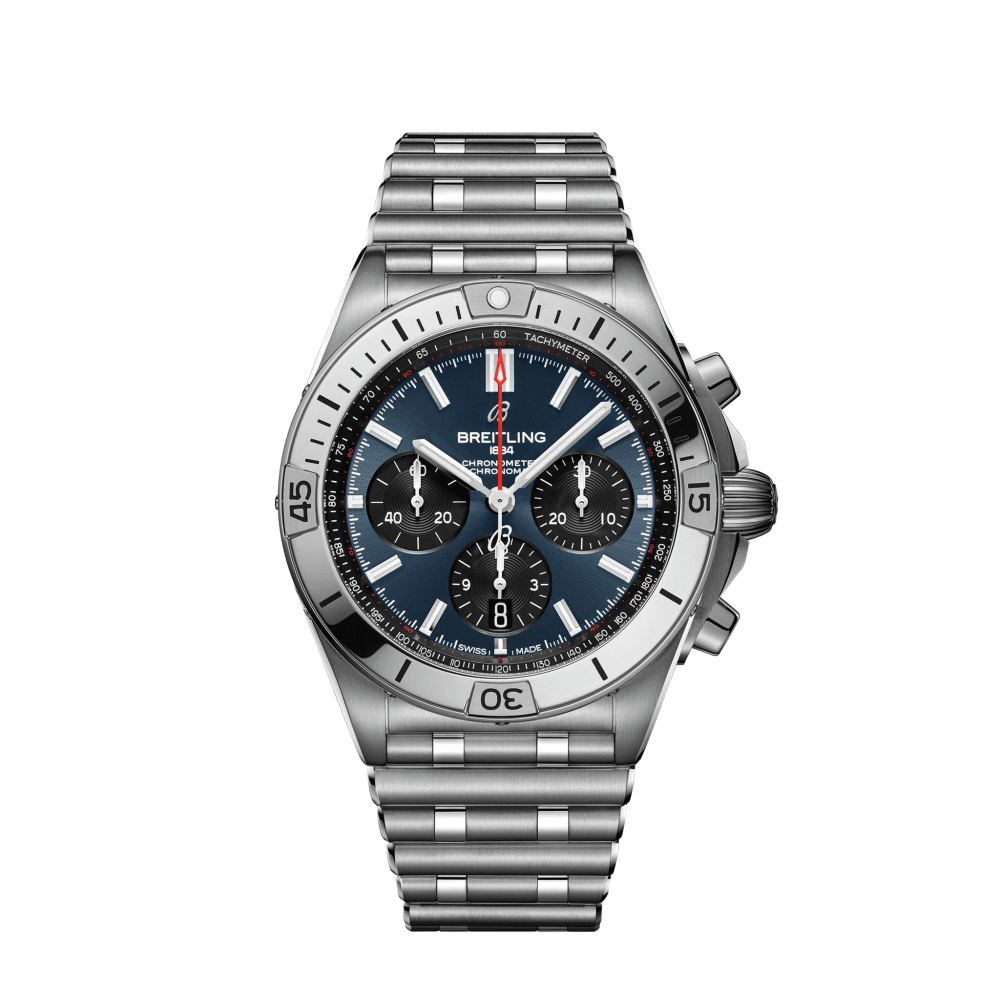 Breitling’s all-purpose watch for your every pursuit. The Chronomat holds a significant place in Breitling’s history. Introduced in 1984, at a time where extra-thin quartz timepieces were the order of the day, Breitling placed a bold bet on an impressively proportioned mechanical watch. Based on the Frecce Tricolori chronograph, which had been developed and launched in 1983 in collaboration with the famed Italian aerial squadron, the Chronomat celebrated Breitling’s centenary in style and marked the return of the mechanical chronograph to its rightfully prominent place at the brand which had built its global reputation on these incredible watches. Available in a variety of materials including stainless steel and 18k red gold, the Chronomat features a 42 mm case and the iconic bezel with the four rider tabs. Available with a range of black, blue, silver, and copper dials, the Chronomat is matched to the signature “Rouleaux” bracelet and is powered by the in-house Breitling Manufacture Caliber 01, a COSC-certified chronometer.