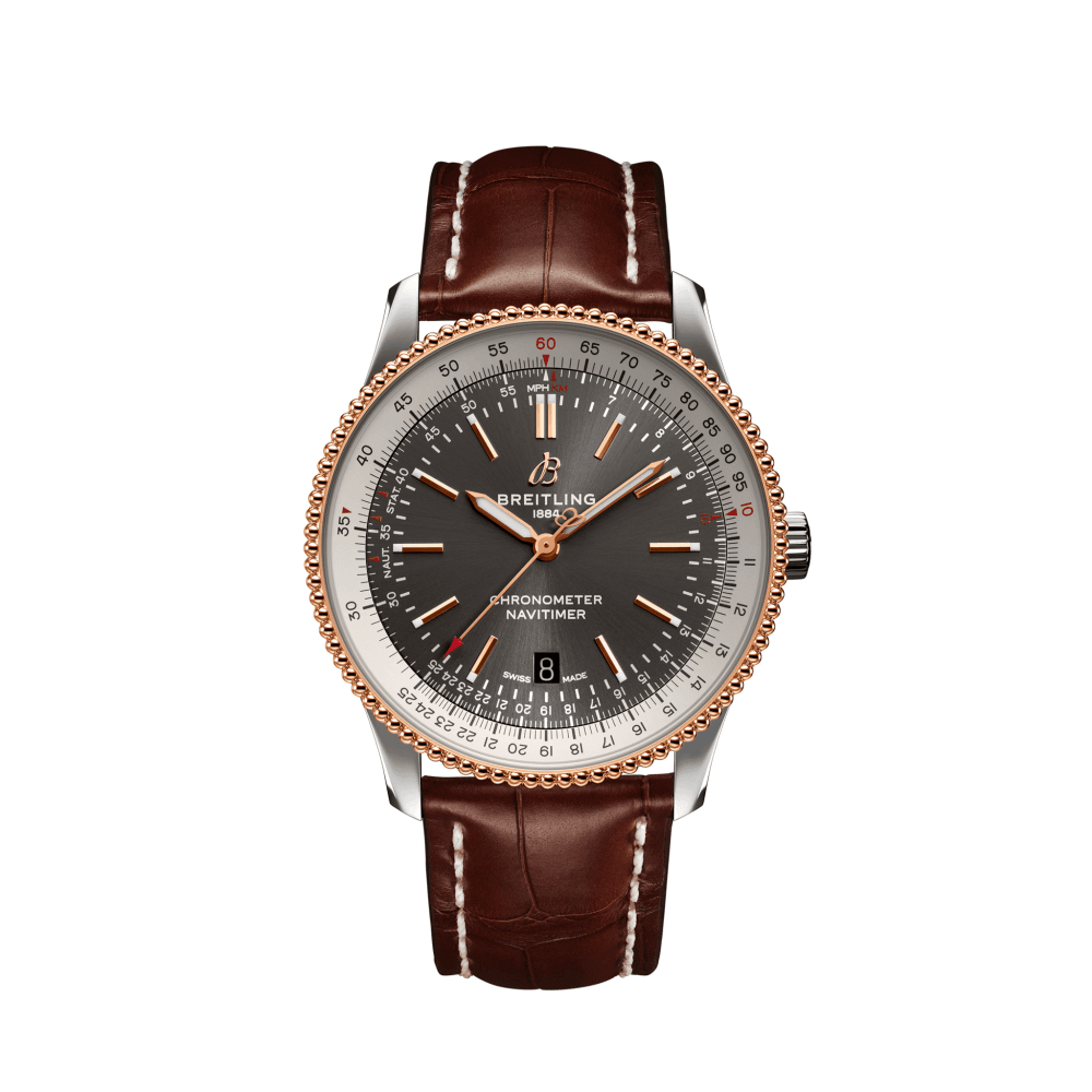 Refined and elegant, the Navitimer Automatic 41 combines the historic appeal of a true icon with the sophistication of a contemporary timepiece. Available in a variety of materials including stainless steel and 18k red gold, the 41 mm case features a beaded bezel and a range of elegant dial colors. Offered either with a matching bracelet or alligator strap that fits both a stainless-steel pin or folding buckle, the Navitimer Automatic 41 is powered by the Breitling Caliber 17, a COSC-certified chronometer.