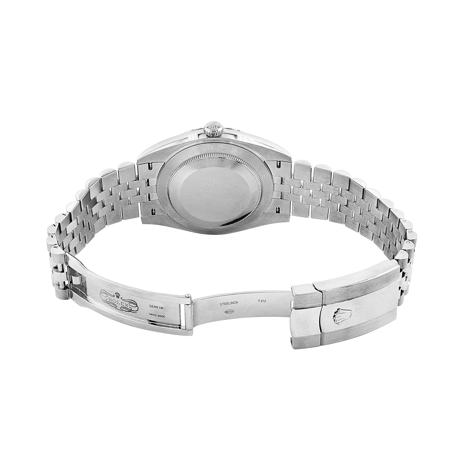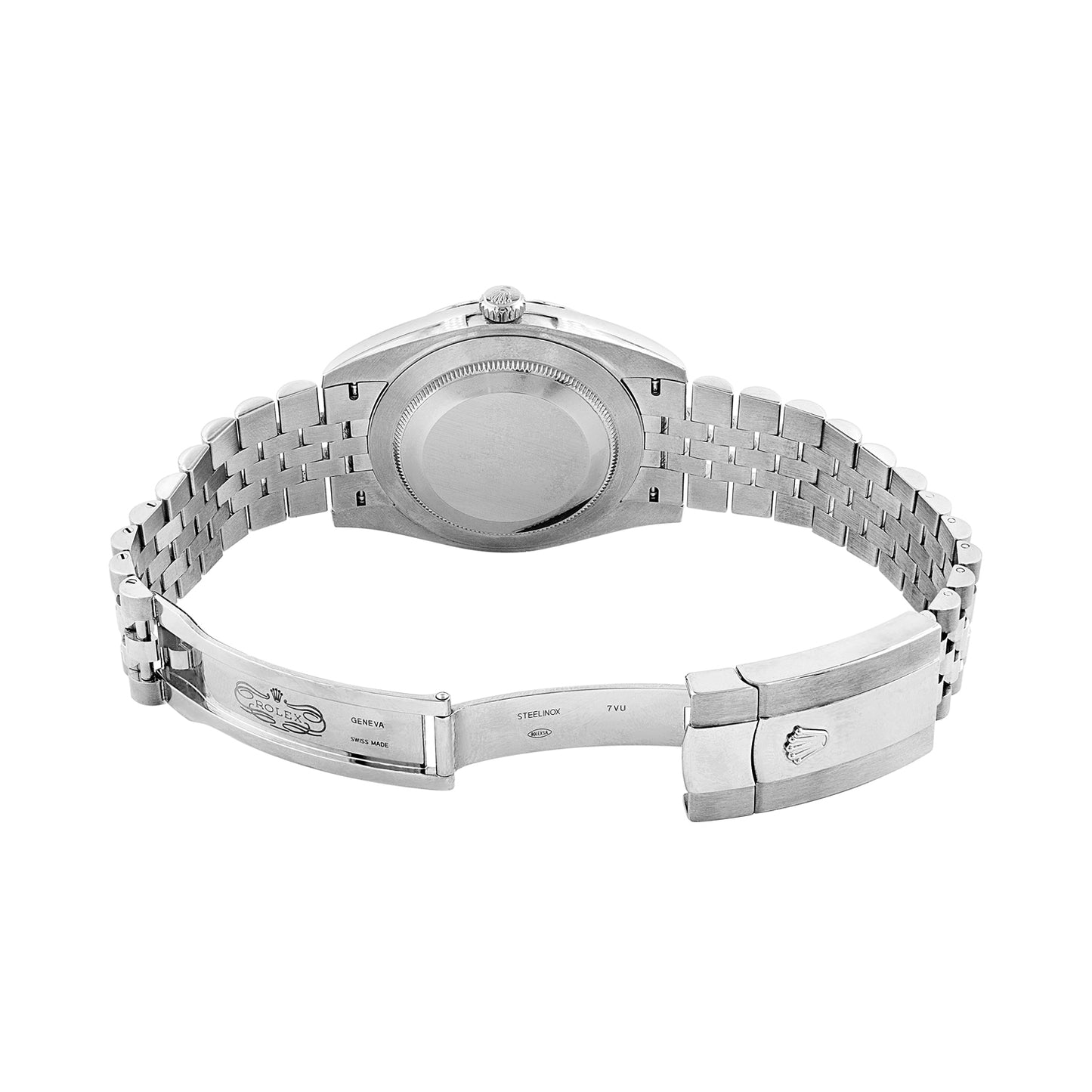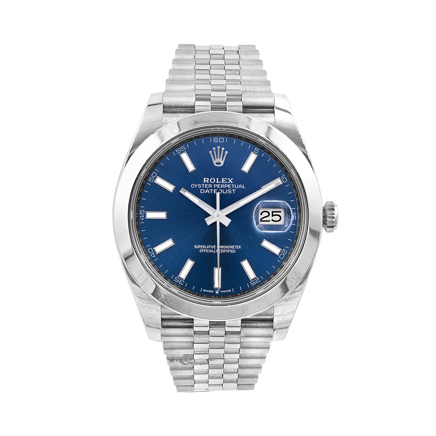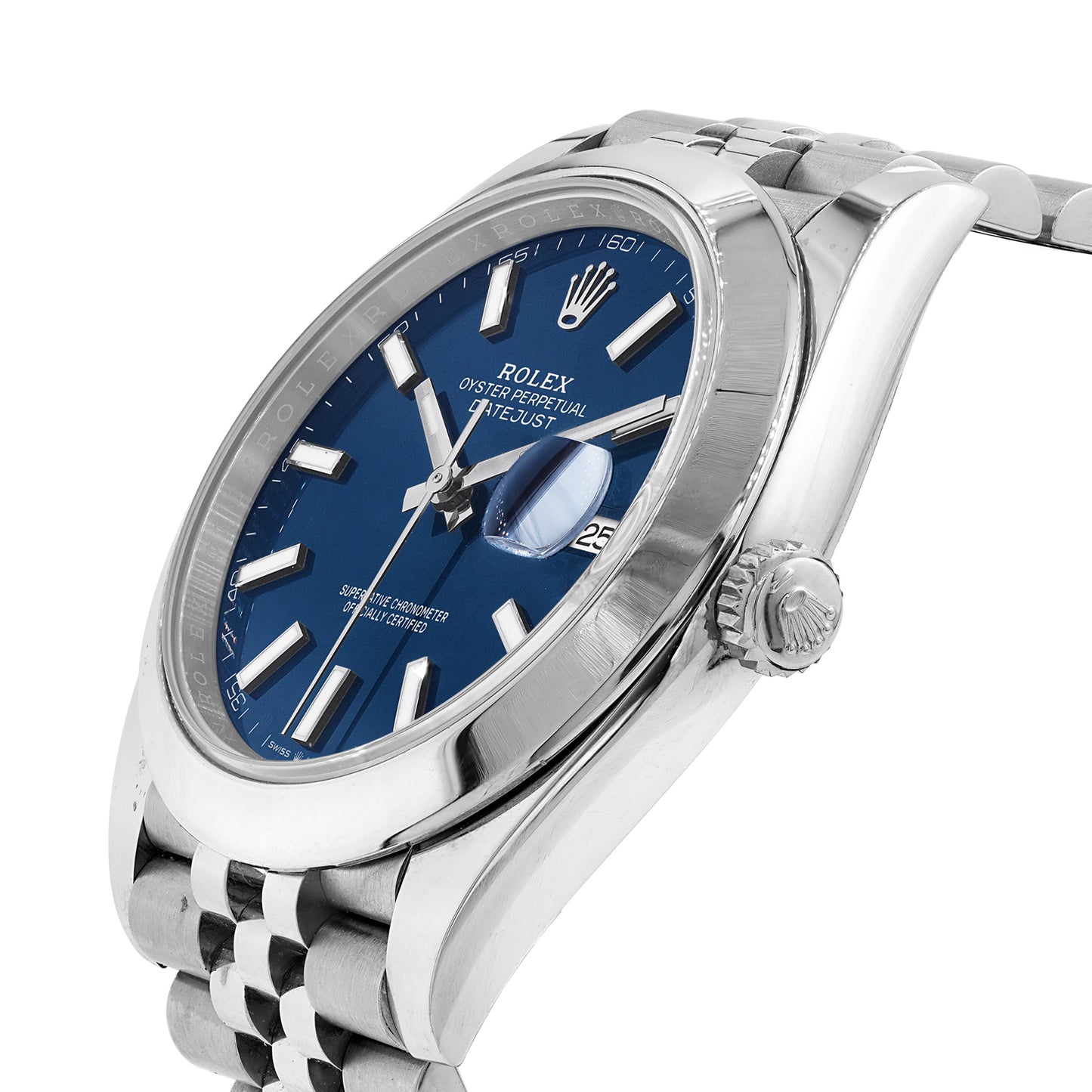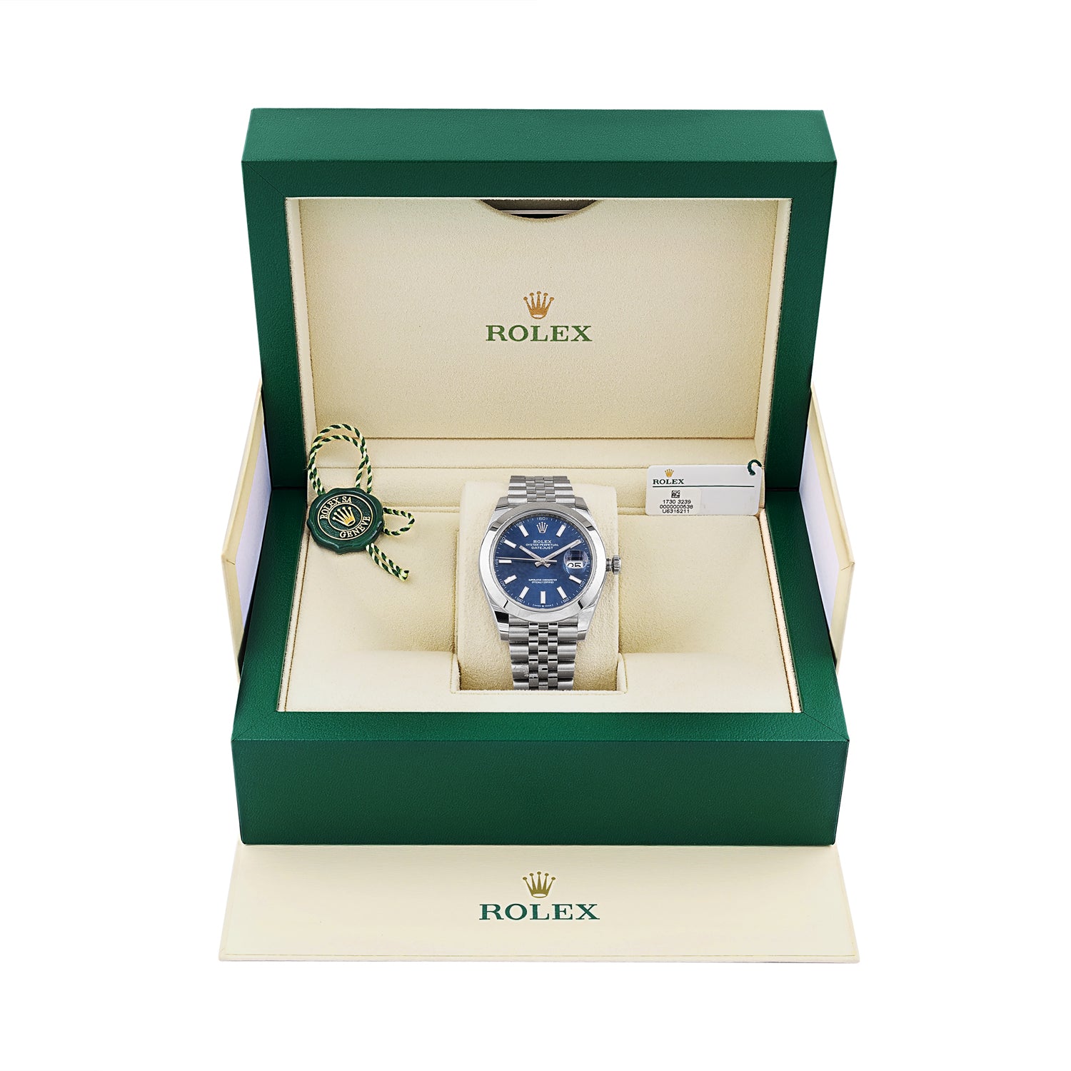 The Rolex Datejust 126300 features a silver stainless steel case with a smooth silver bezel and a blue sunburst dial. It has baton indexes, a folding Oysterclasp bracelet, and is water-resistant up to 100 meters. This Swiss-made watch is powered by a mechanical automatic movement and comes with its original box, papers, and manual. The watch has a 41mm case size and a 20mm lug width, making it suitable for men.Β Comes Complete with box and papers dated 4.20.2024