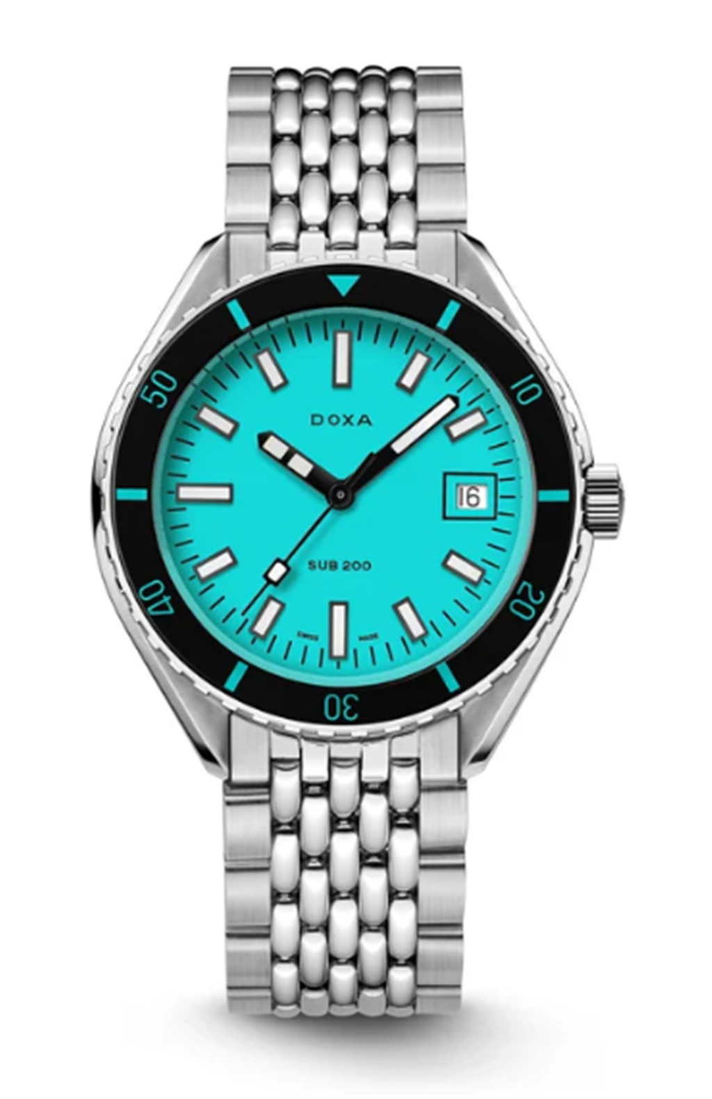 Unveiled at Baselworld 2019, this 3-hand diver's watch has a case made of highest-quality 316L stainless steel. At a diameter of 42 mm, the SUB 200 is topped by a scratch-resistant sapphire crystal with an anti-reflective coating and the distinctive curvature of the domed plexiglass used back in the day. Waterproof to a depth of 200 meters (20 ATM), the model features a unidirectional rotating bezel. All the elements providing dive-relevant information, including the bezel, have a Super‑LumiNova® luminescent coating. The bracelet is 316L stainless steel and features a folding clasp with the DOXA fish symbol.