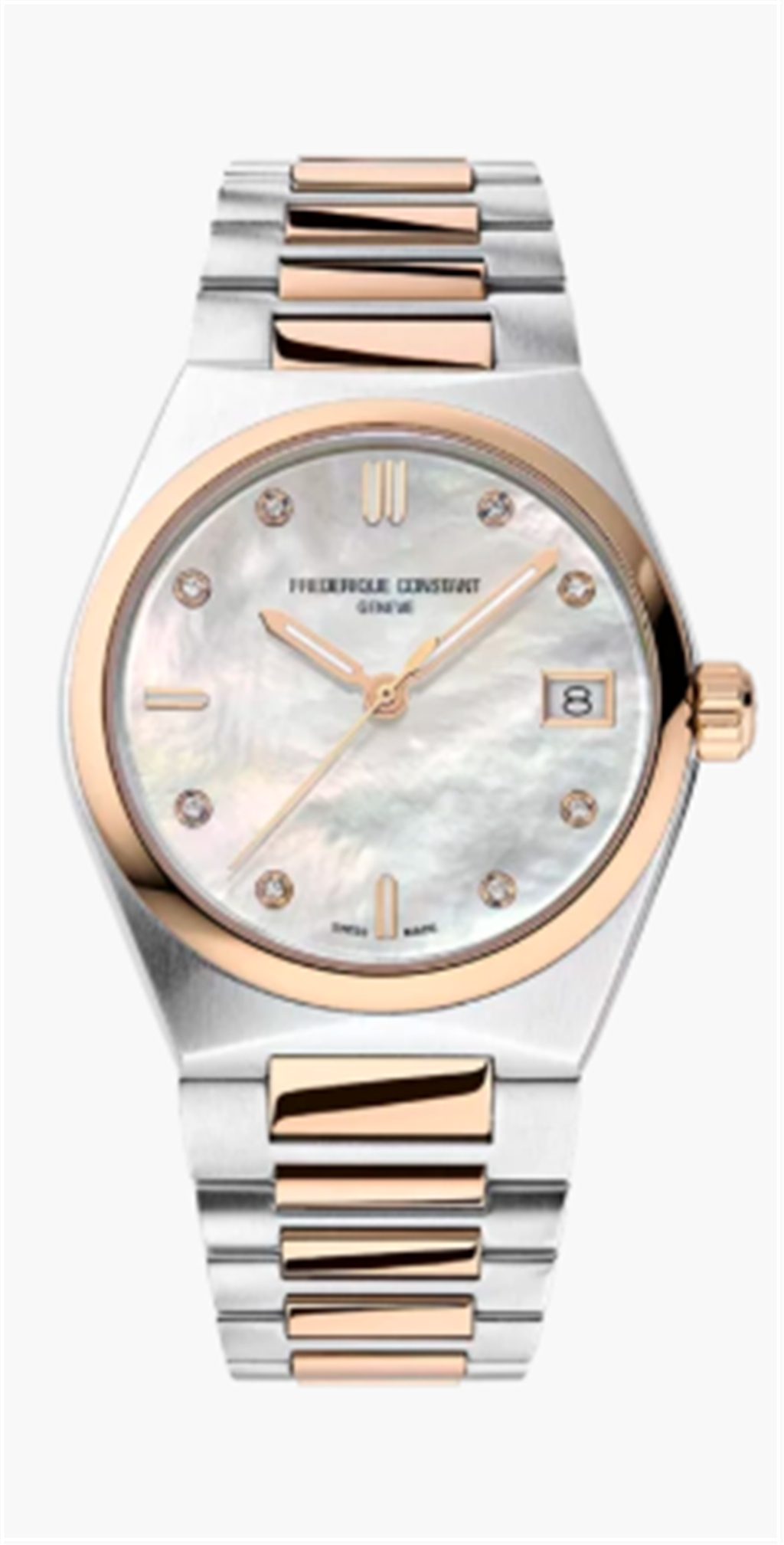 This Highlife Ladies Quartz comes in a 31mm stainless steel and rose gold tone case and features the Highlifeβs hallmark integrated bracelet, that can be changed for the white rubber strap that is included. The white mother of pearl dial has applied gold tipped silver tone indexes at 6, 9 and 12 o'clock, 8 diamond indexes (0.04 carat) and a date window at 3 o'clock.