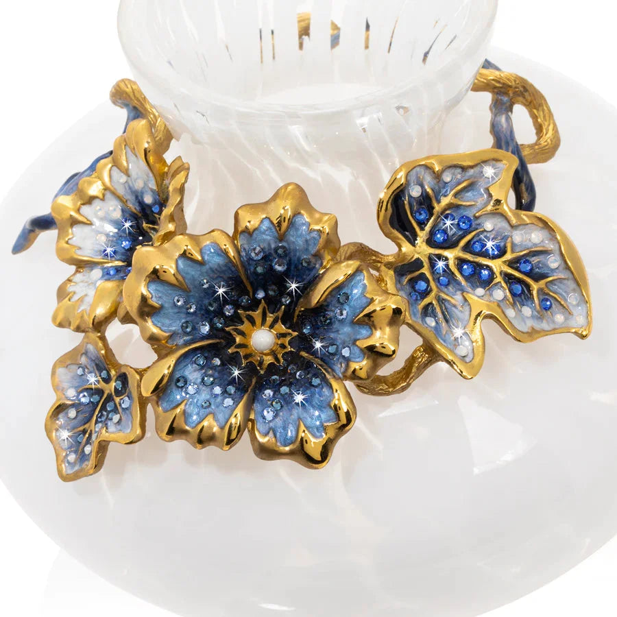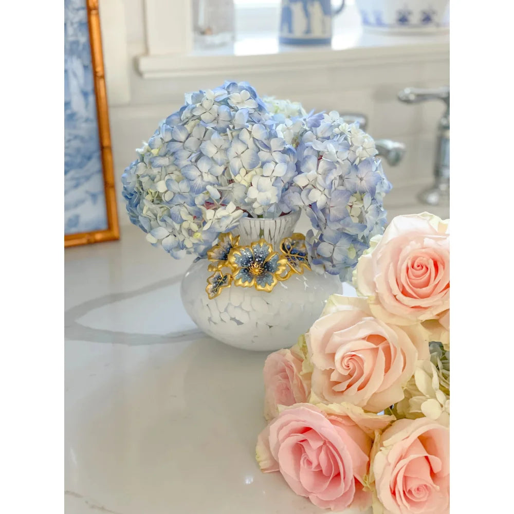Navy and white accents add a fresh accent in every room of your home! Our dappled white glass vase is wrapped in a garland of cream to cobalt hand-painted enamel flowers sparkling with hand-set crystals. The Holland vase is beautiful object onto itself or holding a fresh bouquet.