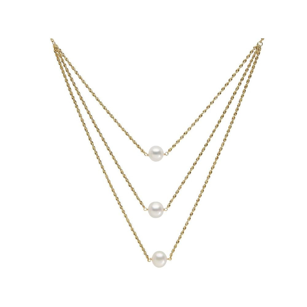 Enhance your neckline with this Honora tri-chain necklace that features a pearl on each 14K yellow gold section.