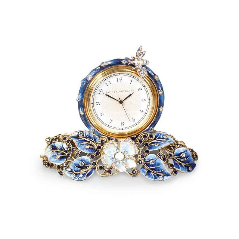 Romantic collages of sculpted leaves and flowers—hand-enameled in indigo, Prussian, and cobalt blues—grace the gorgeous Jay Strongwater Mayfair Leaf & Bee Clock.