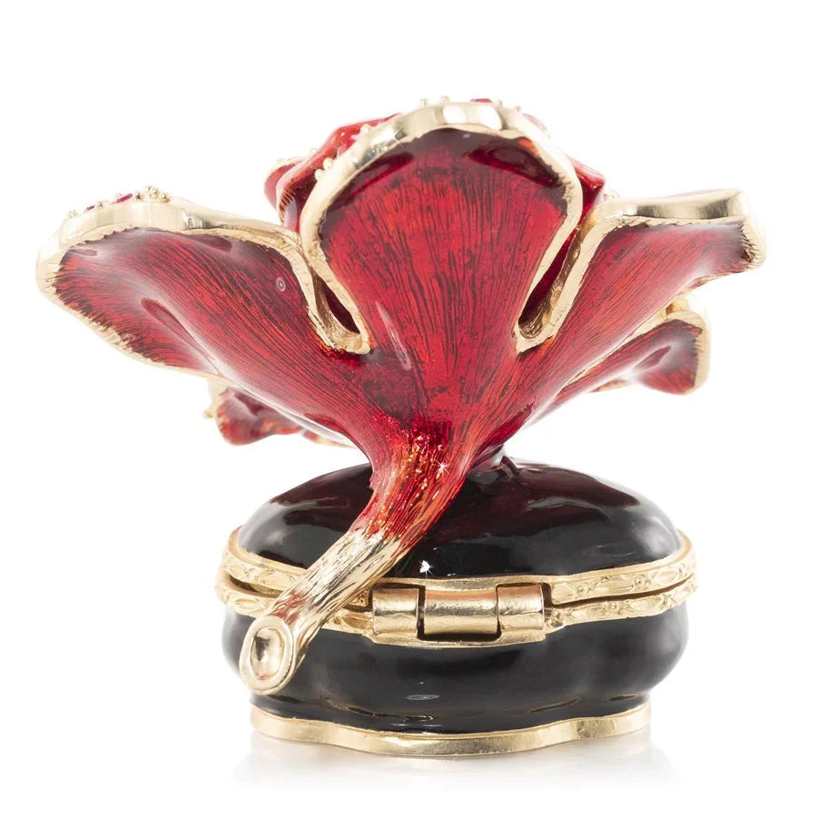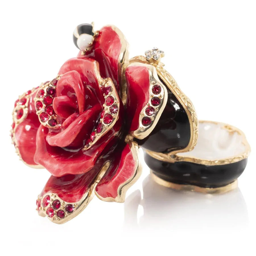 Cast in gorgeous detail and enameled by hand with accents of 14k gold, a Swarovski®-encrusted cherry-red rose blossoms atop a black enamel box. Opening to reveal a clean white enamel center with gold trim, this piece is the embodiment of beauty in simplicity.