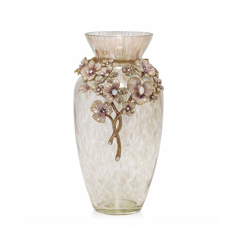 A cascading necklace of delicate jeweled blossoms wraps around the Polly Bouquet Vase. Mouth-blown clear glass dappled with shimmering gold with a pewter metal collar finished in 18K Gold. Hand-painted in blush pink enamels and hand-set with light peach and opal colored crystals from Swarovski. The perfect gift of love!