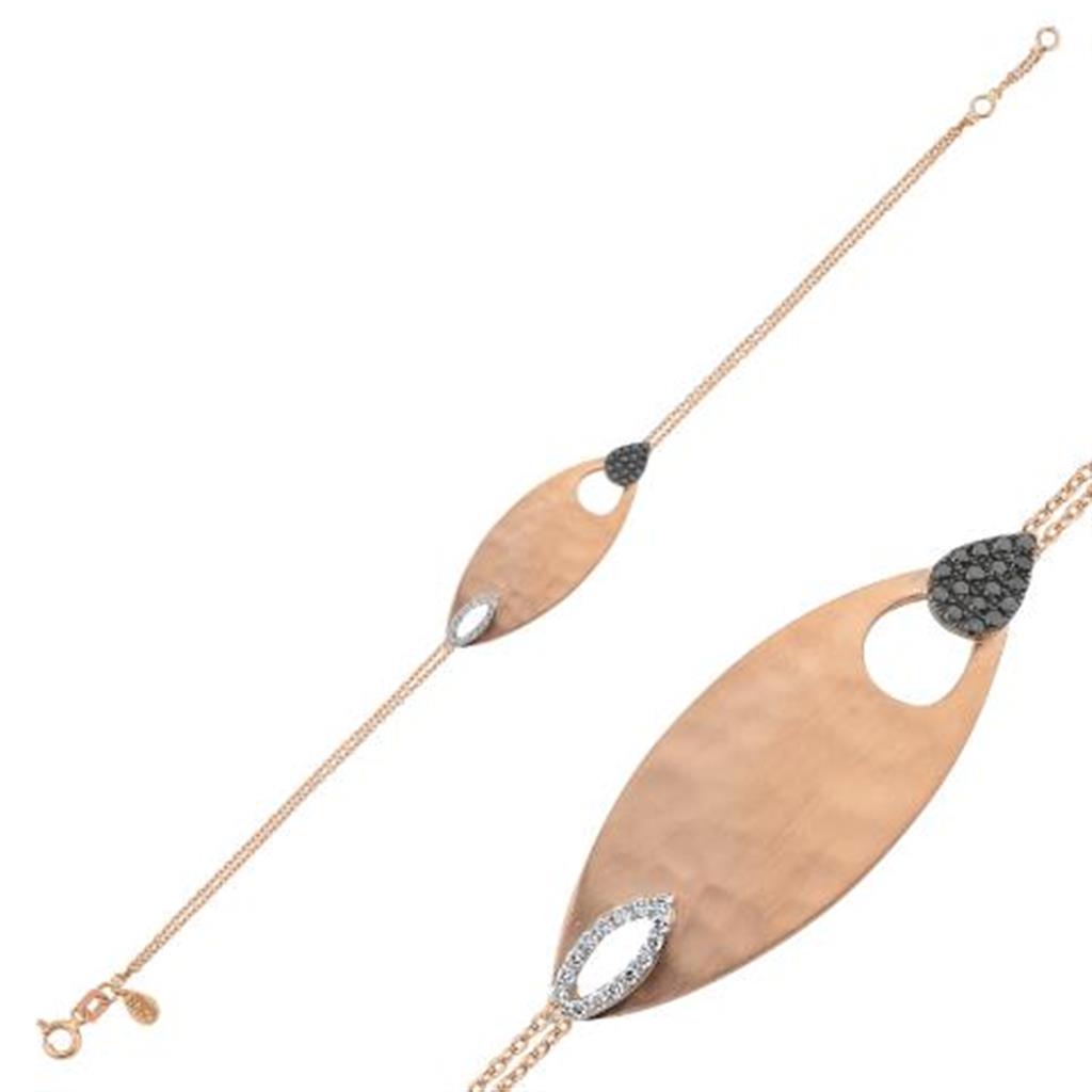 This stunning oblong rose gold bracelet features both black and white diamonds on either end making this bar bracelet different than the rest.