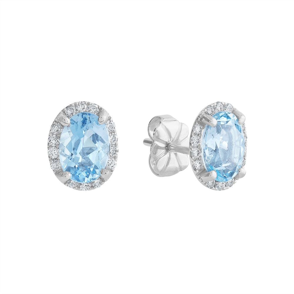 These white gold oval stud earrings sparkle with an aquamarine stone surrounded by diamonds.