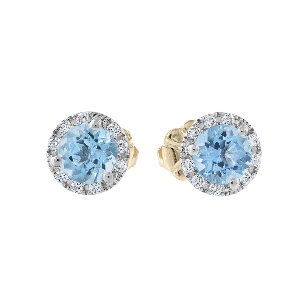 Sparkling, round aquamarine stones are surrounded by diamonds in these white gold stud earrings.