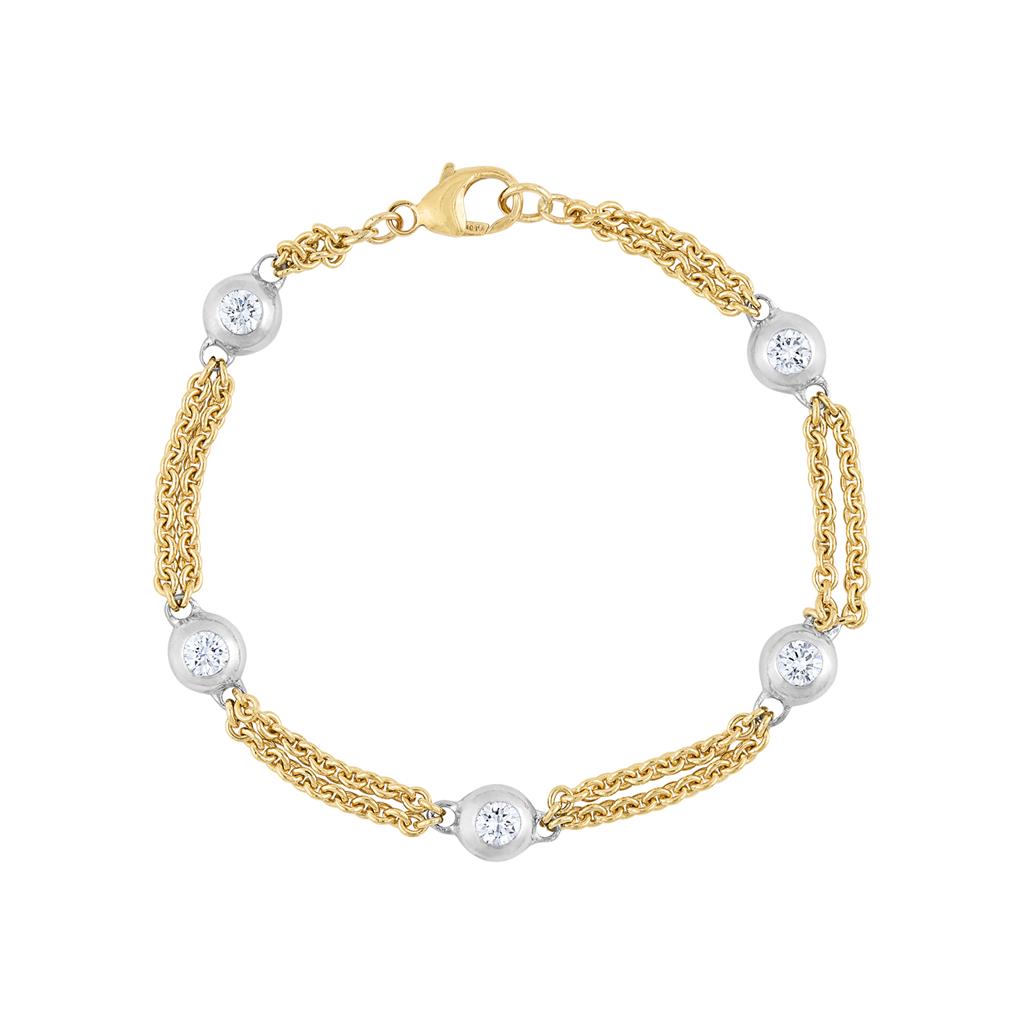 A double-chain yellow gold bracelet outfitted with 5 white gold disks each with a sparkling diamond.