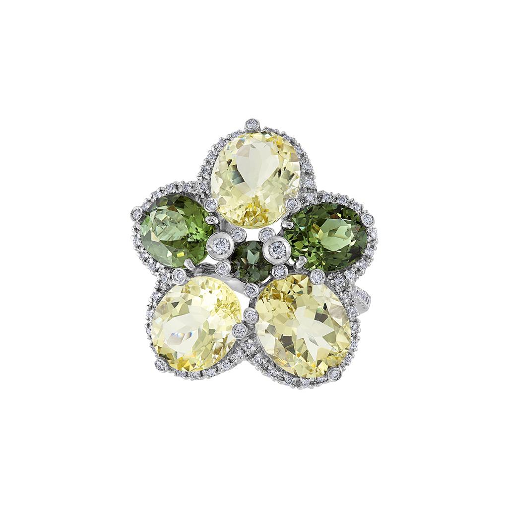 LaViano Fashion 18K White Gold Green Tourmaline and Lemon Quarts Diamond Ring