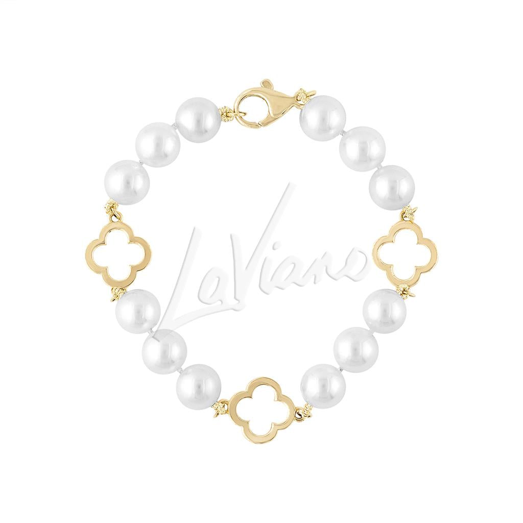LaViano Fashion 18K Yellow Gold Pearl Bracelet with Clover Motifs