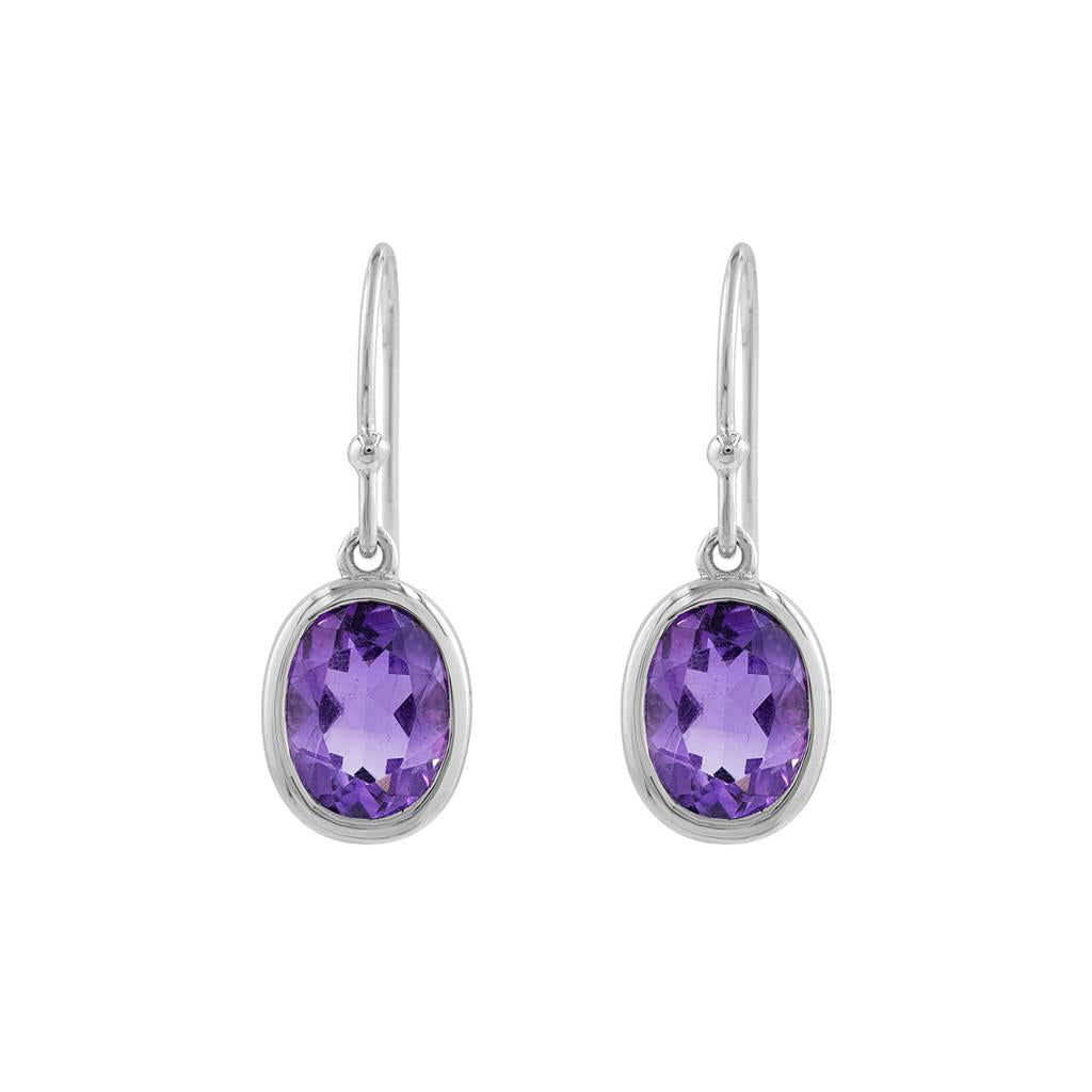 An affordable alternative to white gold earrings, these sterling silver earrings have a beautiful amethyst at the bottom.