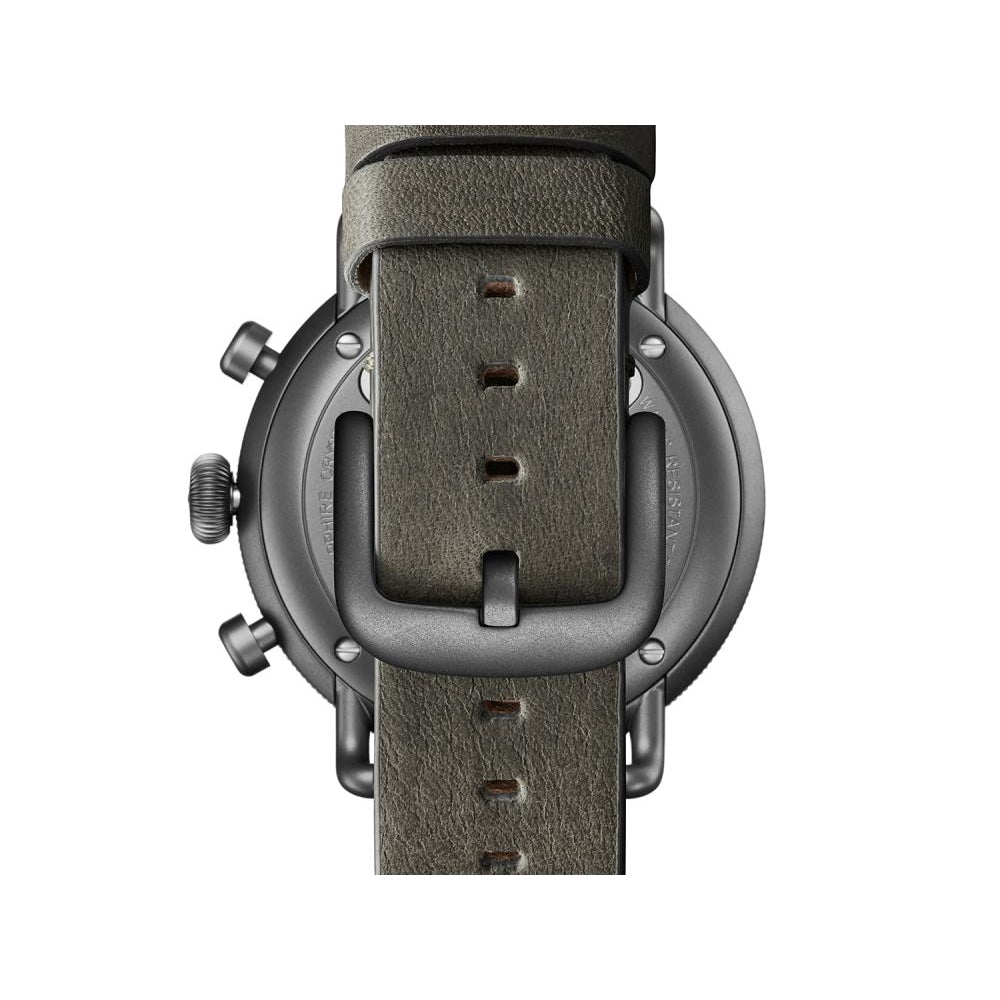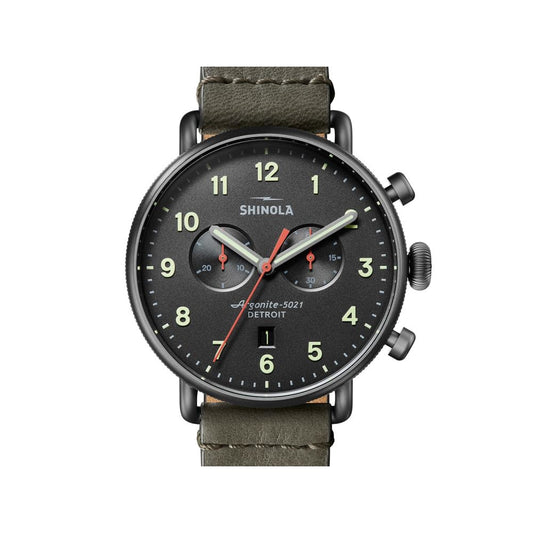With a sandblasted gunmetal PVD case and dial, this 43mm Canfield Chrono is an understatement that stands out. The bold contrast between the green-tinted details and the dark gray dial are reminiscent of the colors and design of vintage radios. The red remote second hand sweep and calendar aperture add another layer of contrast for that uniquely retro look. Double-domed sapphire crystal helps protect this dark timepiece from scratches, so it can be worn year after year.