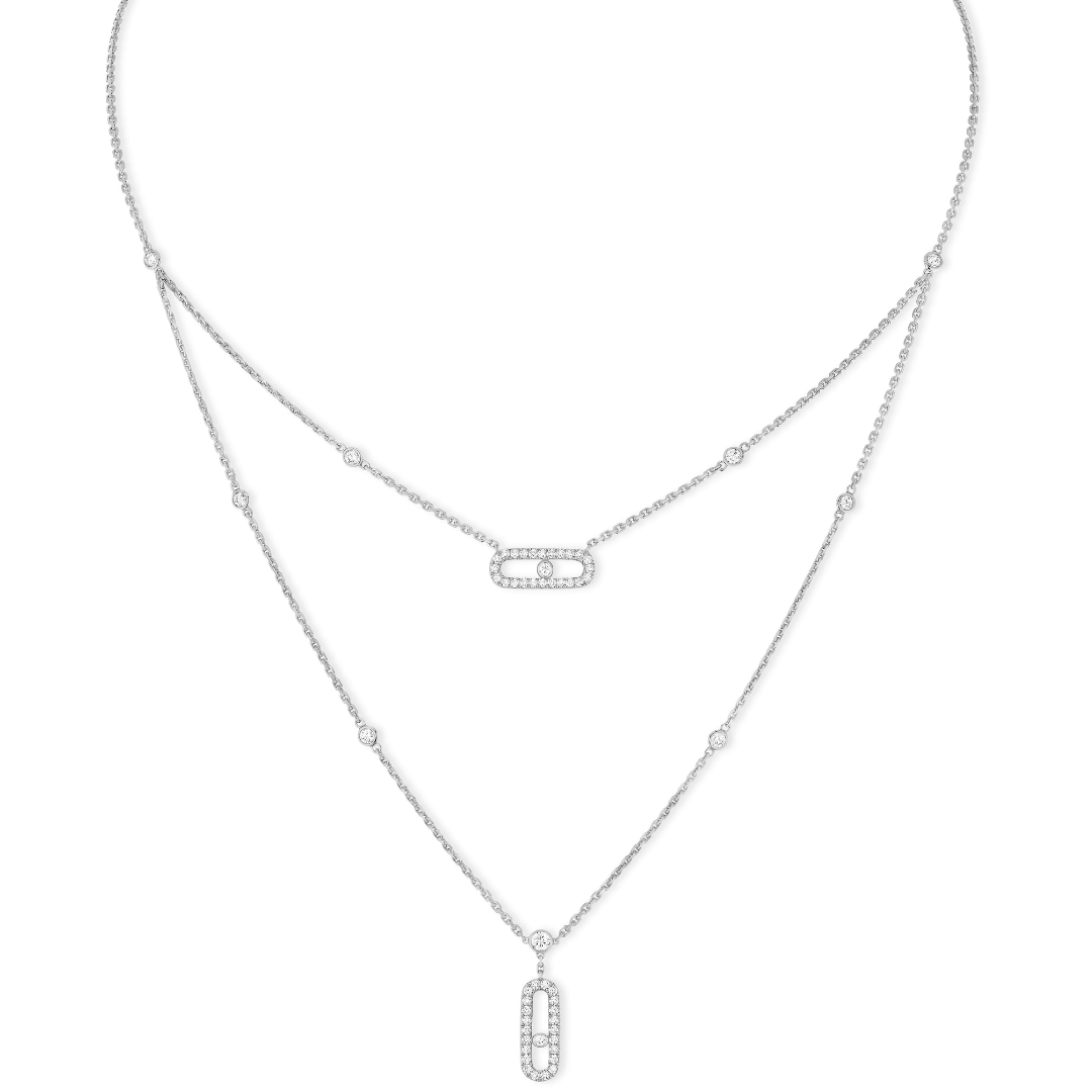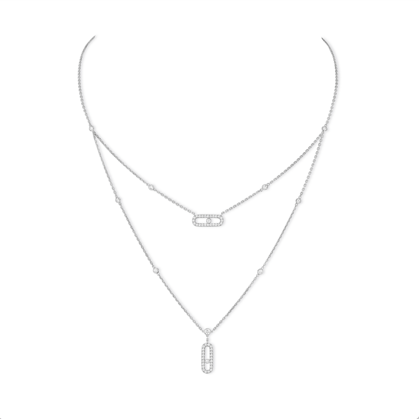 The Messika Move Uno has been reinterpreted as a two-row white gold diamond necklace. The Move Collection’s signature, a bezel-set diamond slides and shimmers with every movement inside each polished gold & diamond motif. The subtle shimmer of white gold makes it a metal of choice, even for women who don’t usually wear diamond jewelry. Don't miss the diamond detail found in the chain as well, bringing extra light to this diamond necklace.