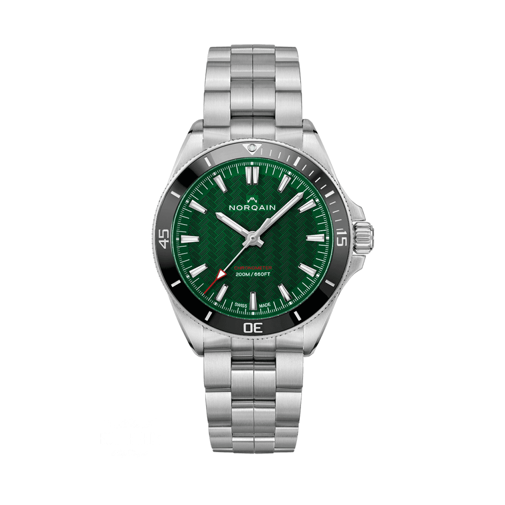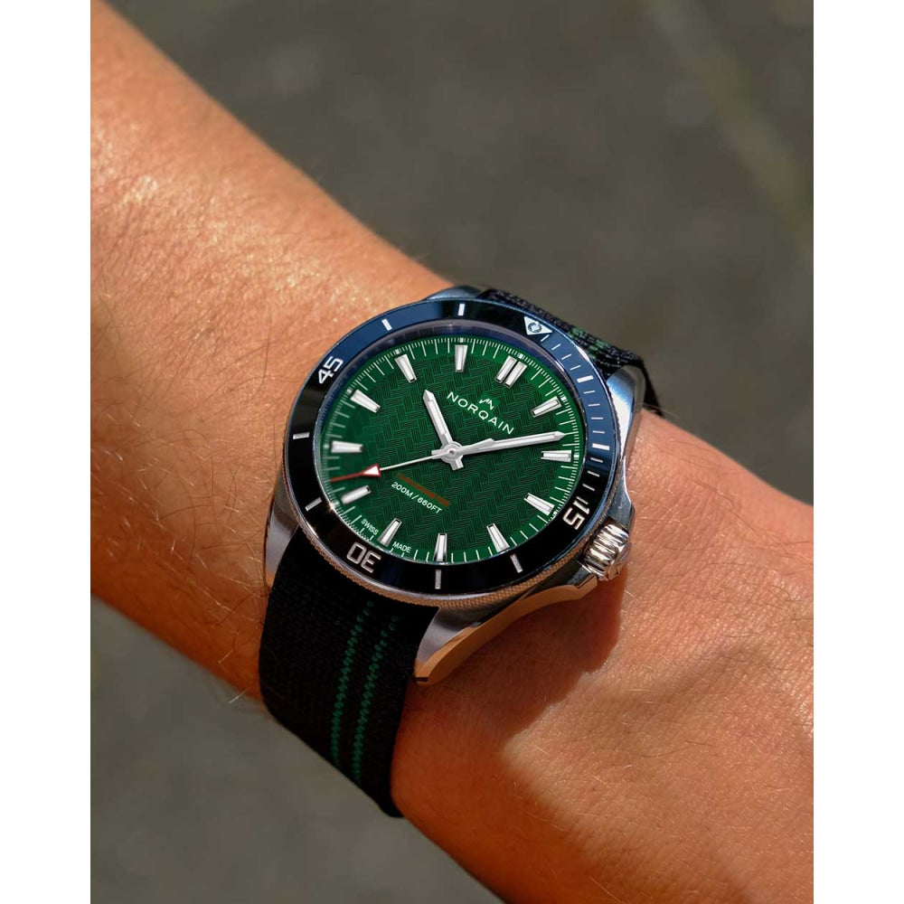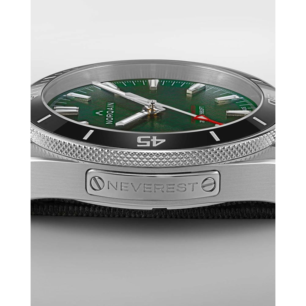 This 40mm automatic-winding Adventure NEVEREST timepiece features a refreshed take on the recognisable NORQAIN dial design, with a pattern in forest green and black. X1 Superluminova covers the indexes and hands so you can read the time no matter where your adventures take you. The stainless steel watch has a knurled stainless steel bezel complete with a black ceramic ring. This timepiece is water resistant to 200 metres and is equipped with NORQAIN’s Manufacture Calibre NN20/1, which is visible through the sapphire glass caseback.