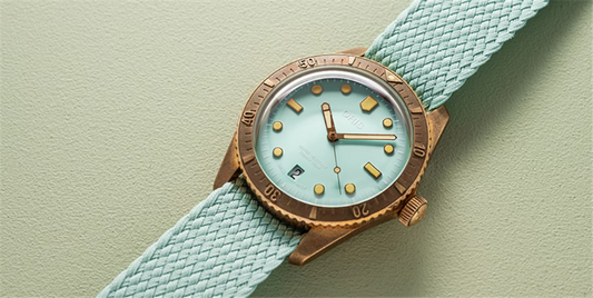 Multi-piece bronze case, bronze minute scale top ring. Sapphire, domed on both sides, anti-reflective coating inside. Stainless steel, special engravings, screwed.