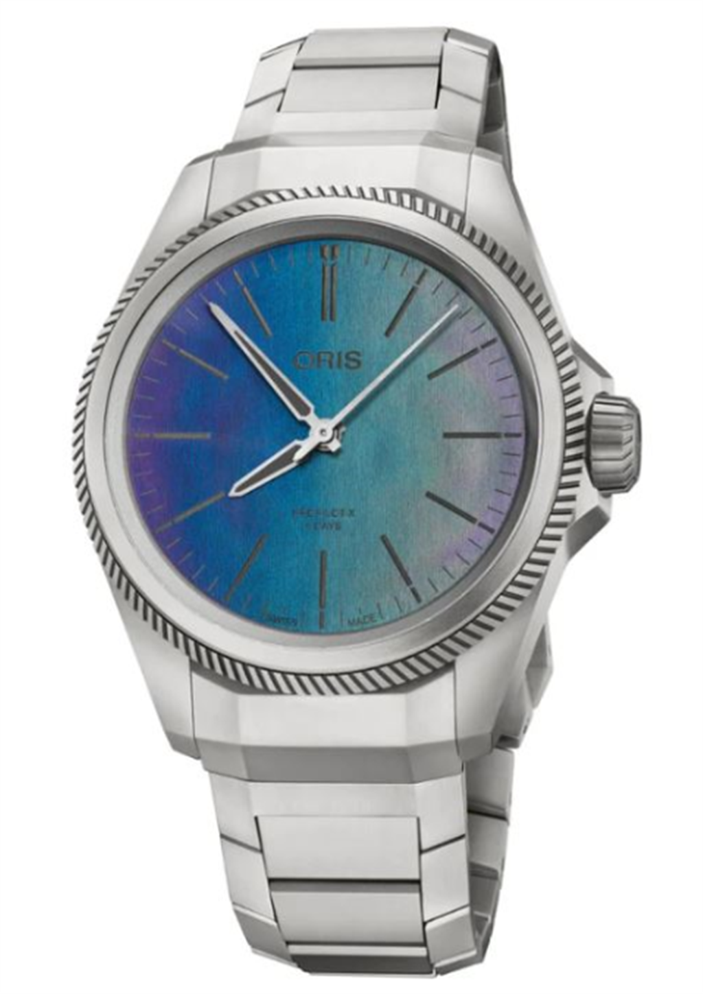 Meet the new Oris ProPilot X Calibre 400 Laser. Its 39mm case and bracelet are both in titanium, and itβs powered by our game-changing Calibre 400 five-day automatic. But the story this time is in its colorful dial, which is created using an innovative lasering technique never seen in watchmaking before. Incredibly, thereβs not a drop of color pigment in it. Instead, the blue, green and violet finish is created by reflected light. Itβs a technological beauty.