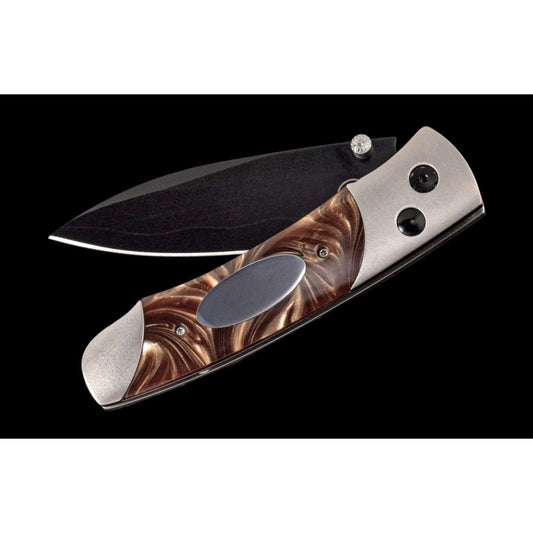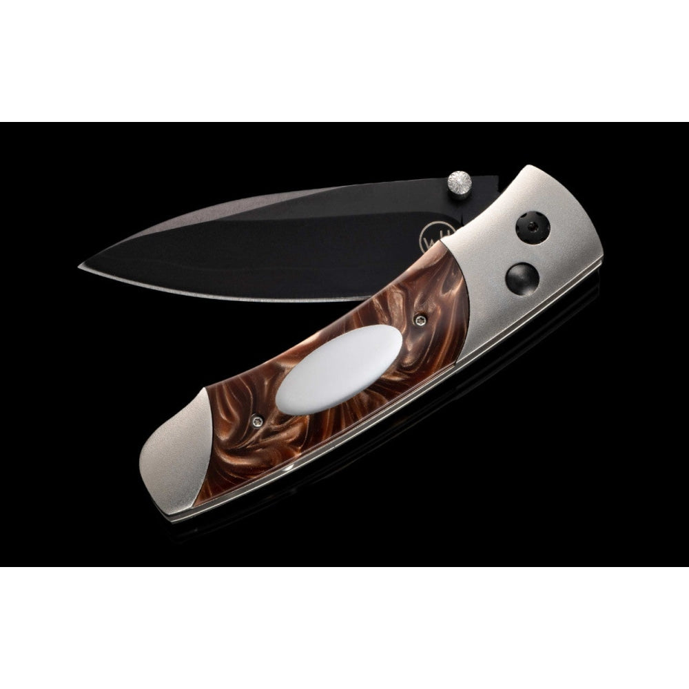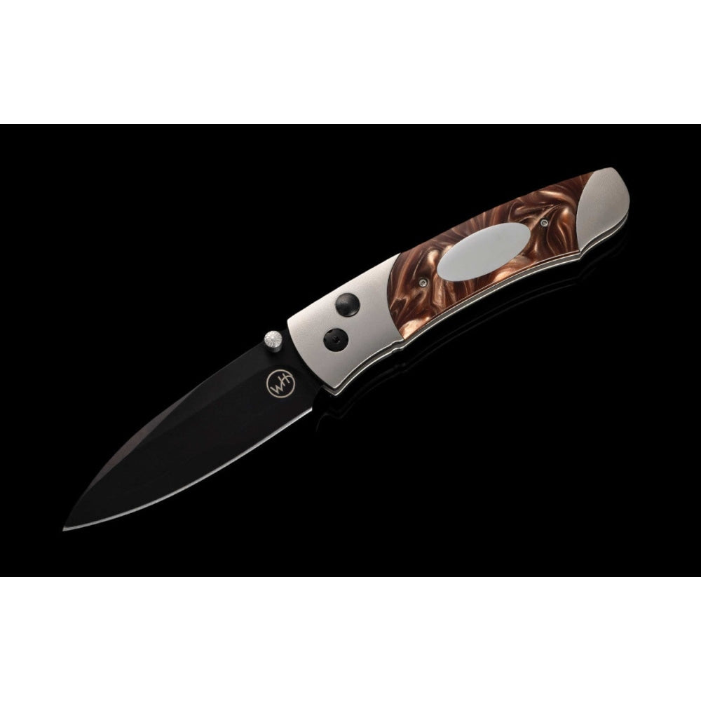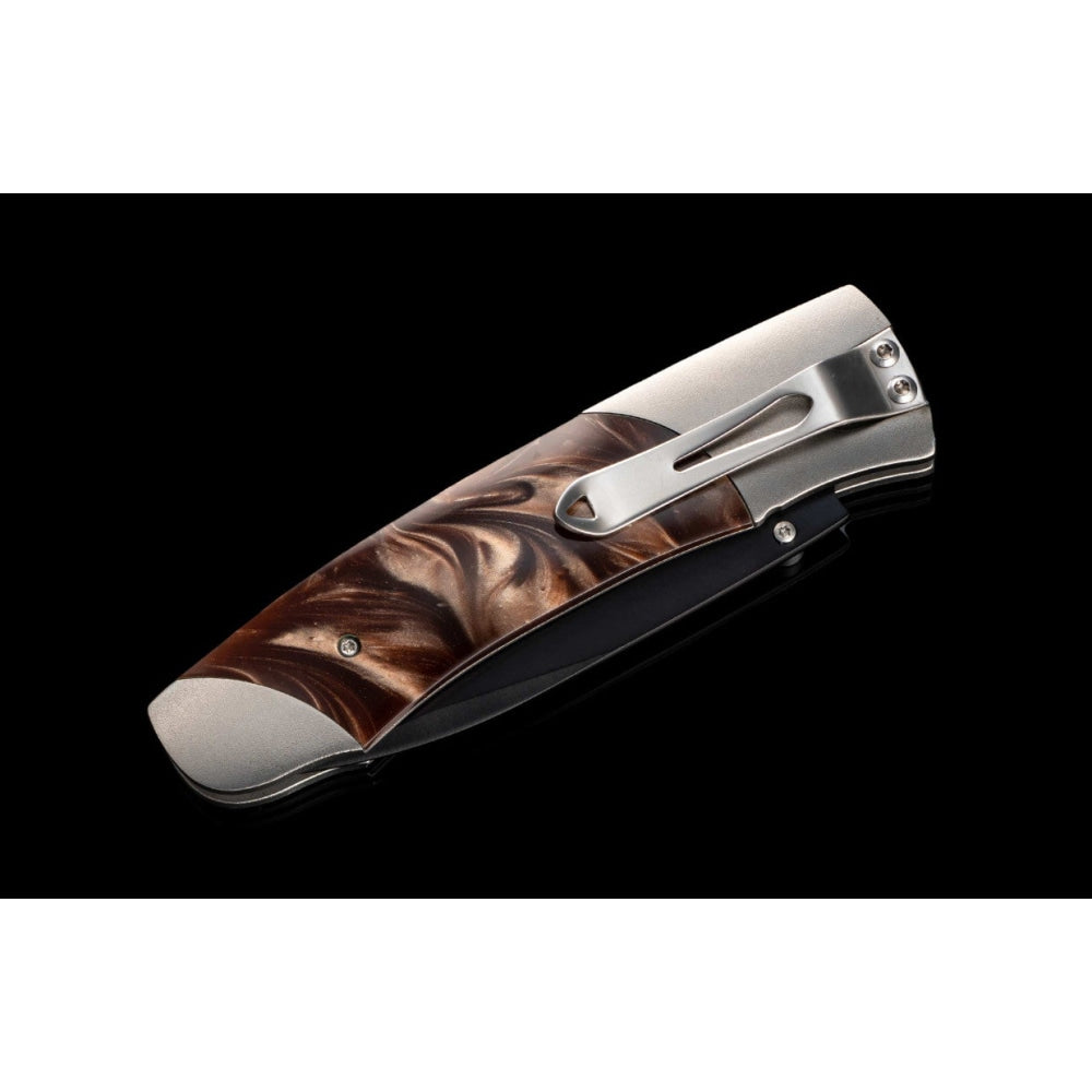 The A200-3B features a frame in hand-finished aerospace grade titanium, and inlays of compressed acrylic resin with an inset engraving plate. The blade is crafted from a three layer billet featuring a core of 10Cr15Mov, a rugged stainless steel honed to a razor’s edge. Final touches include black DLC (diamond like coating) on the blade and select fittings, and a pocket clip that allows safe ‘tip-down’ carry.
