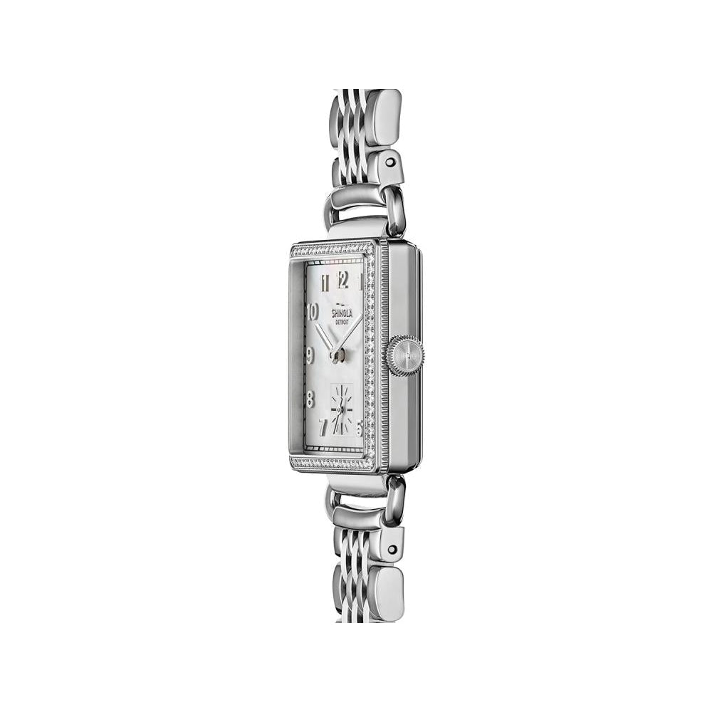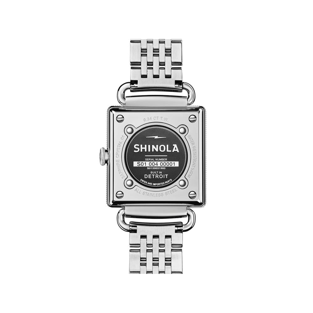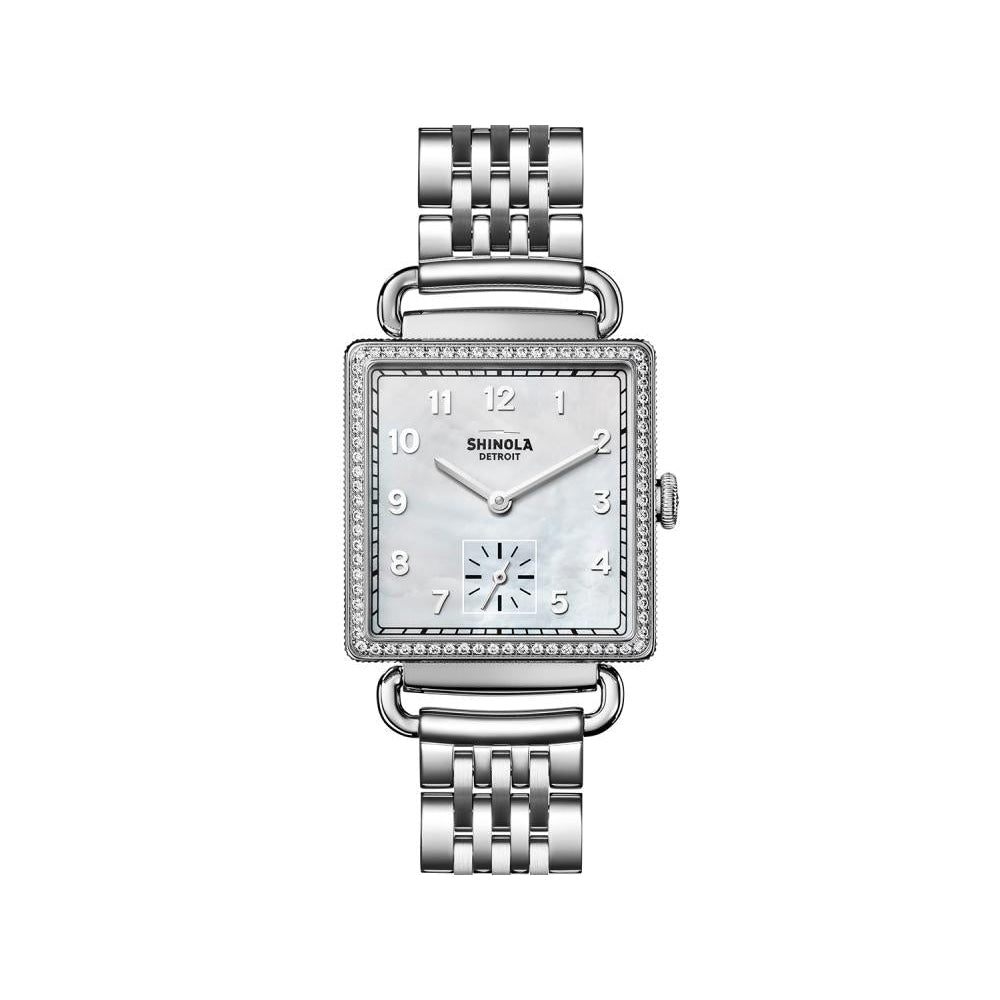 It's more hip than ever to be square. A contemporary take on a classic design, The Cass is a brand new timepiece that introduces the elegant square shape to our collection. Petite in size but bold by nature, this stainless steel case features 78 brilliant cut VS1 diamonds, set with the utmost care and precision to ensure maximum sparkle. The carat weight can be found on the watch's case back. The diamonds used in the Shinola Diamonds collection are conflict-free, based on written guidelines provided by the supplier. They have been purchased from legitimate sources not involved in funding conflict and in compliance with United Nations resolutions. Railroad tracking on the dial and a refined pumpkin crown elevate the style further. Includes mother of pearl dial, stainless steel 7 link Quick Change bracelet that can be changed without use of tools, wire lugs and swing lug construction for a customized fit that curves to the female wrist.