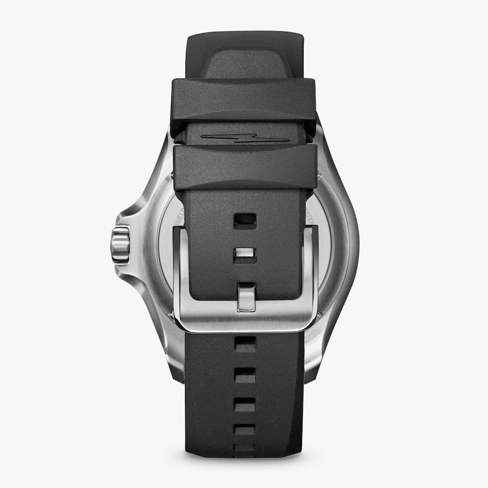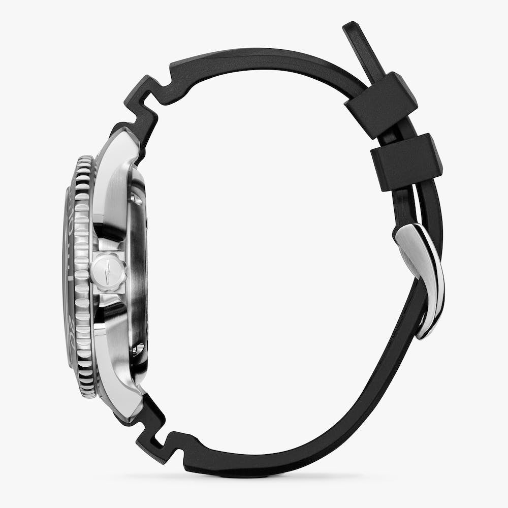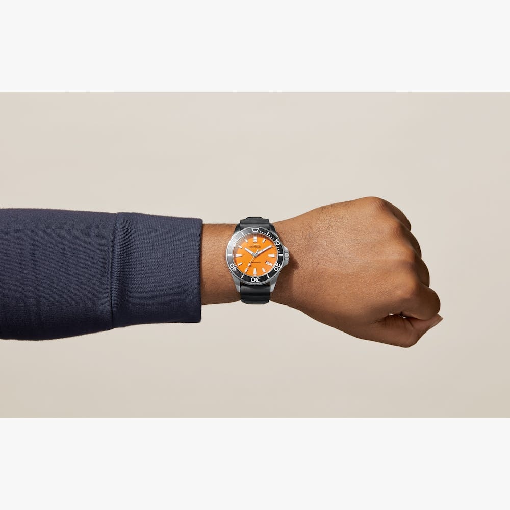 This 43mm Shinola Monster hits the mark when it comes to a dive watch you can trust. Its technical acumen makes the iconic aesthetic of Shinola an added bonus. Powered by the SW200-1 automatic movement, which features 26 jewels and a 38-hour power reserve, this high-grade 316L stainless steel timepiece is meticulously engineered to withstand extreme pressure and has a depth rating of 1,000 feet. With durable, anti-reflective sapphire crystal and an anti-magnetic shield, the Shinola Monster is designed specifically with divers in mind. A unidirectional bezel keeps track of precious time underwater, and a black rubber strap expands to provide a secure fit while diving. While its orange enamel dial reminds us of those summer sunrises on the shoreline of Lake Huron, the star quality of this timepiece is its performance.