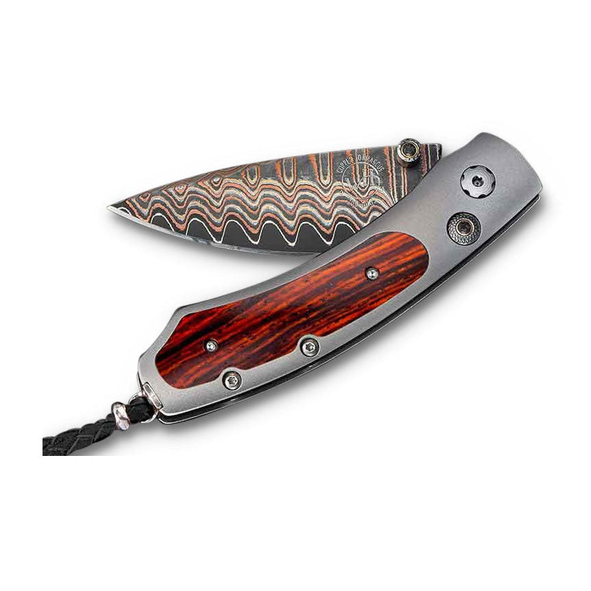This William Henry Kestrel 'Copper River' features a beautiful frame in lightweight aerospace-grade titanium, inlaid with a beautiful piece of cocobolo. The blade is 'Copper 'Wave' damascus with an extra strong core in VG-5; the one-hand button lock and the thumb stud are set with spinel gemstones.