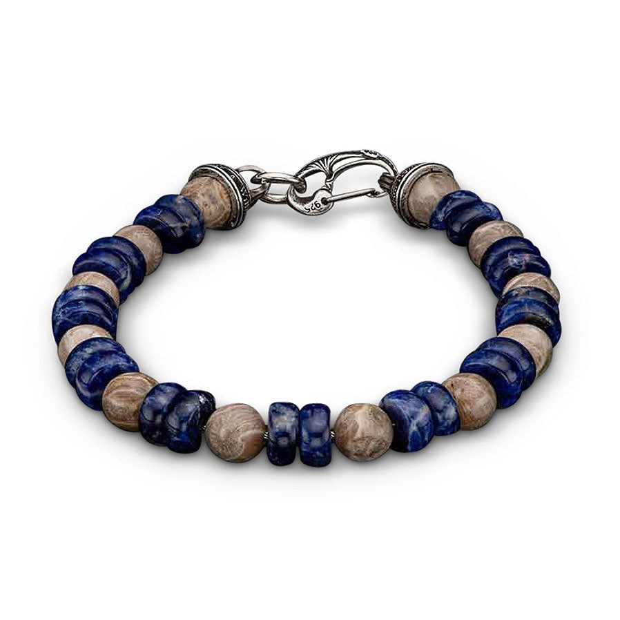 Bring in the ocean breeze with the Virtue from William Henry. This large bracelet features fossil coral jasper, offset with sodalite spacer beads. Built in our Oregon studio, using aircraft grade stainless cable with welded sterling silver end caps and clasp. Neutral tones, a bit of whimsy, perfect for solo wear or stacked on the wrist.