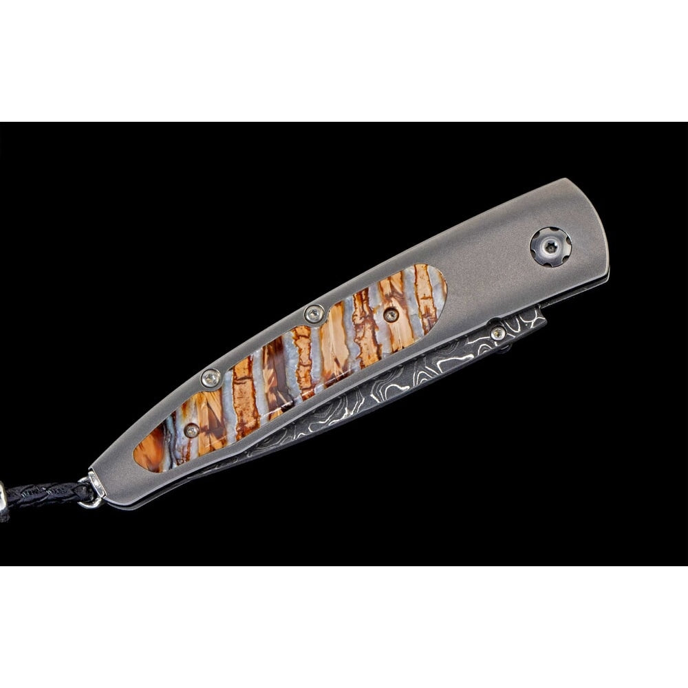 The Lancet 'Intrepid' features a frame in aerospace-grade titanium, inlaid with a piece of 10,000 year-old fossil Woolly Mammoth tooth. The blade is hand-forged 'Intrepid' damascus by Chad Nichols; the one-hand button lock and the thumb stud are set with black onyx gemstones. Sleek, elegant, refined, and comfortable in the hand and to the eye, the Lancet defines the essential gentlemanβs folder in the modern world. The βReversoβ features some of the exotic materials and hand-forged metals that are the hallmark of William Henry's collections; a distinctive personality statement to be worn and used for a lifetime.