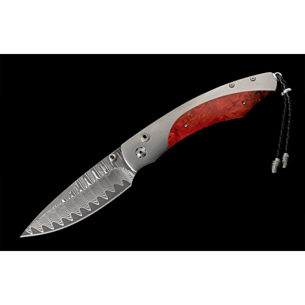 The Spearpoint ‘Poplar' features a frame in aerospace-grade titanium, inlaid with beautiful red Poplar burl. The blade is 'Wave' damascus with an extra strong core of VG-10; the one-hand button lock and the thumb stud are set with white topaz gemstones. A remarkable design that gives you an instrument with a full-size secure grip, and a versatile deep-belly blade, the Spearpoint epitomizes William Henry’s core philosophy – that superlative function deserves to be elevated to superlative art. The ‘Poplar’ features some of the exotic materials and hand-forged metals that are the hallmark of William Henry's collections; a distinctive personality statement to be worn and used for a lifetime.
